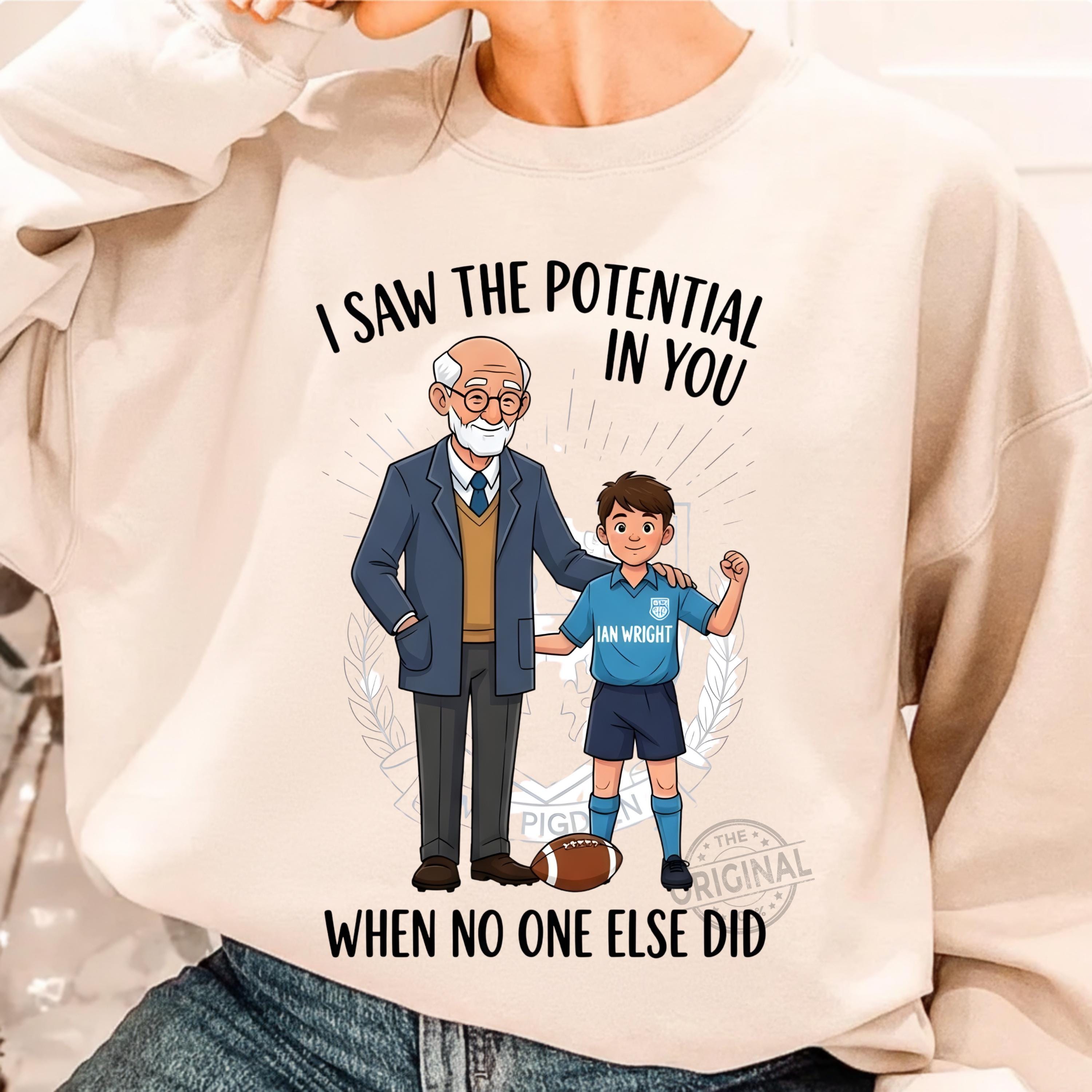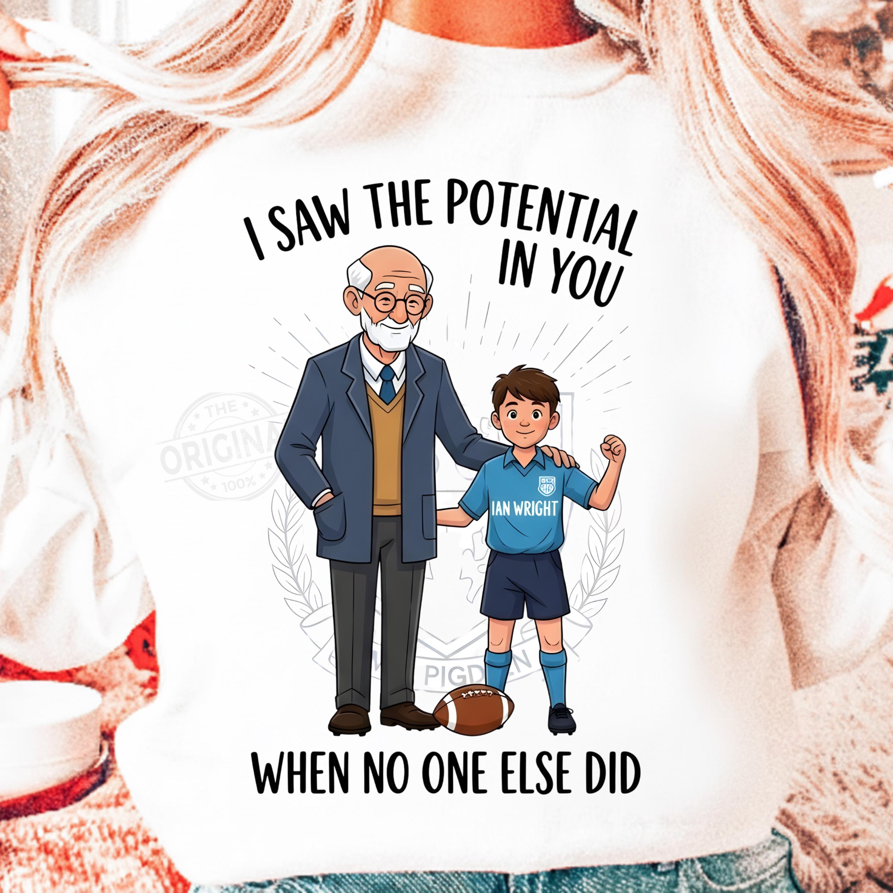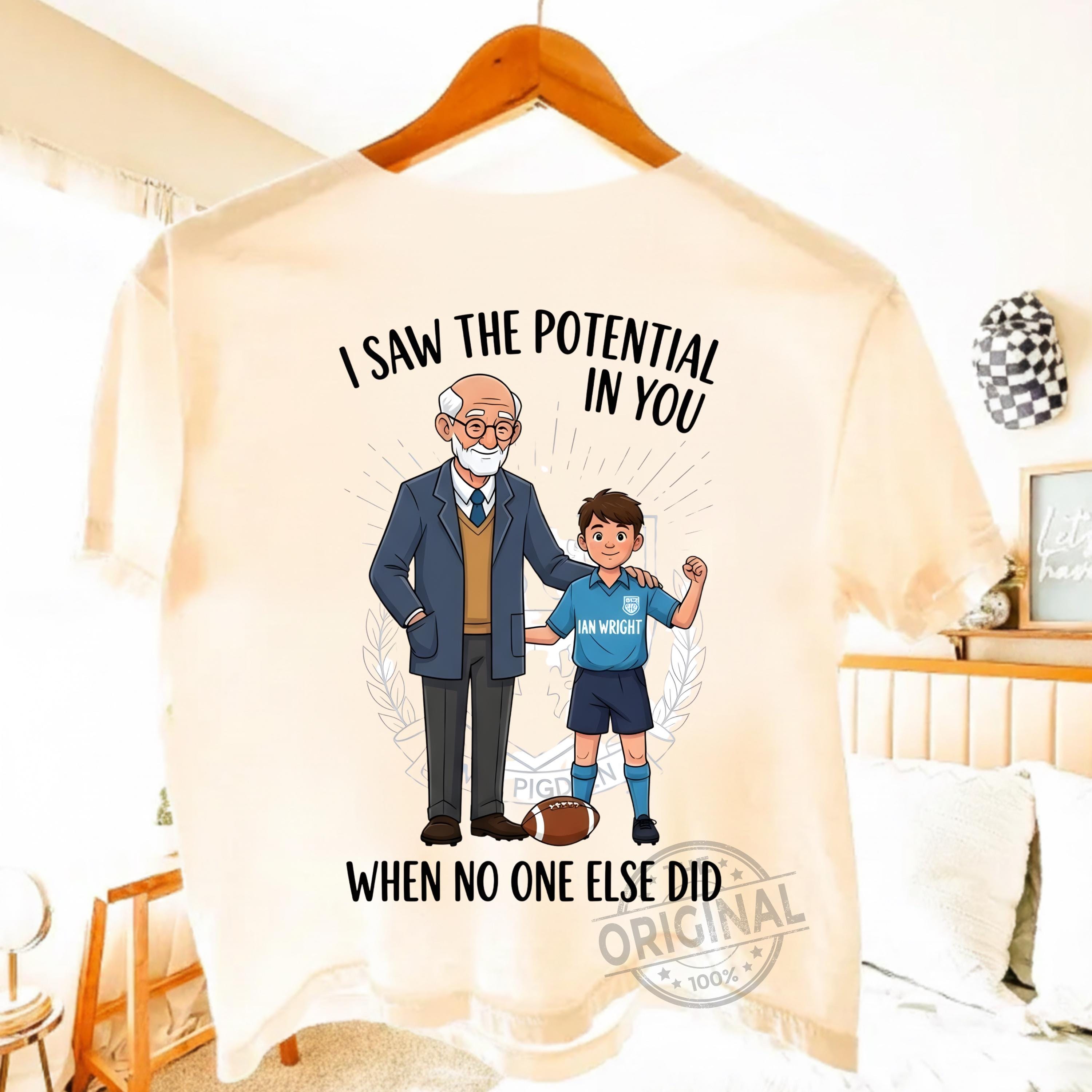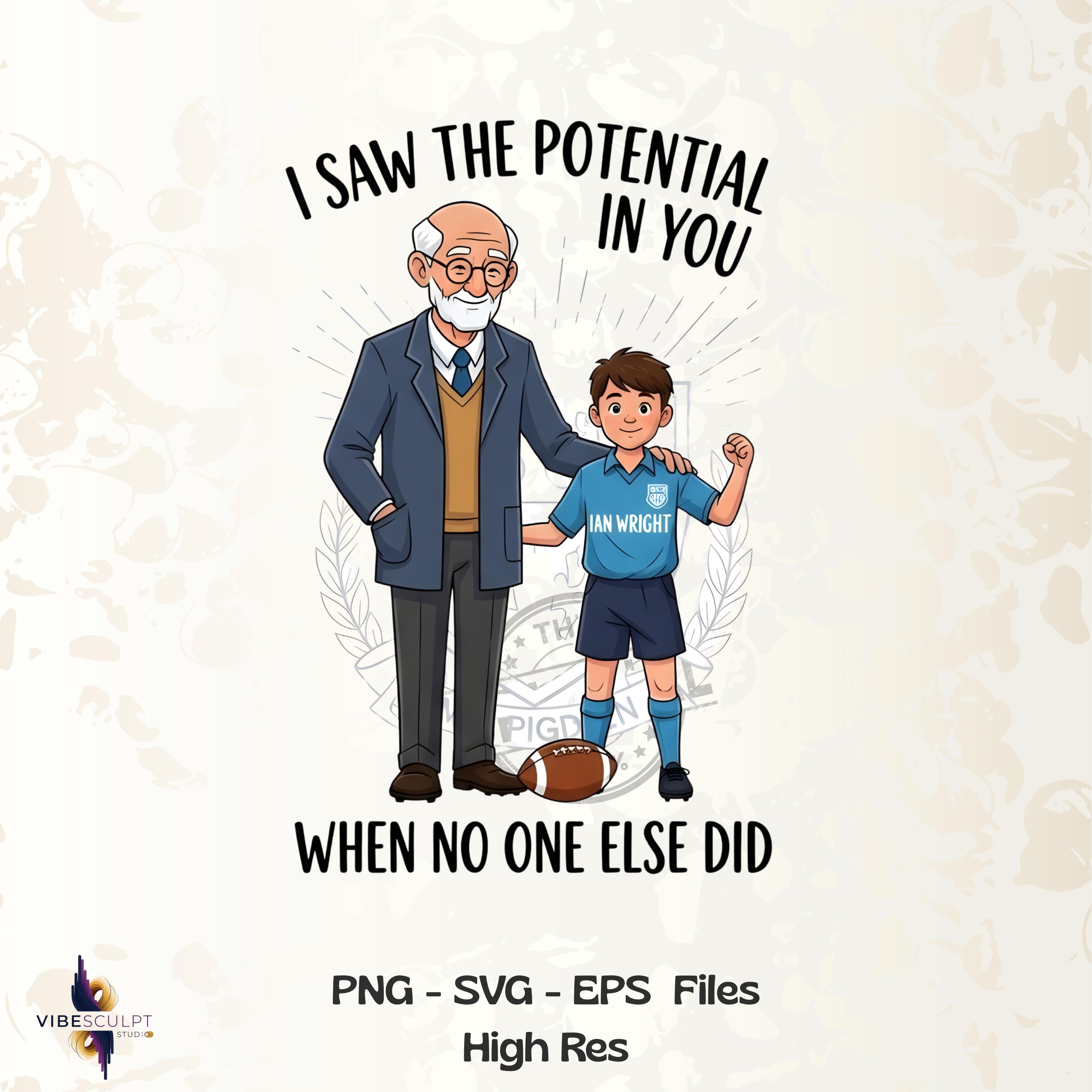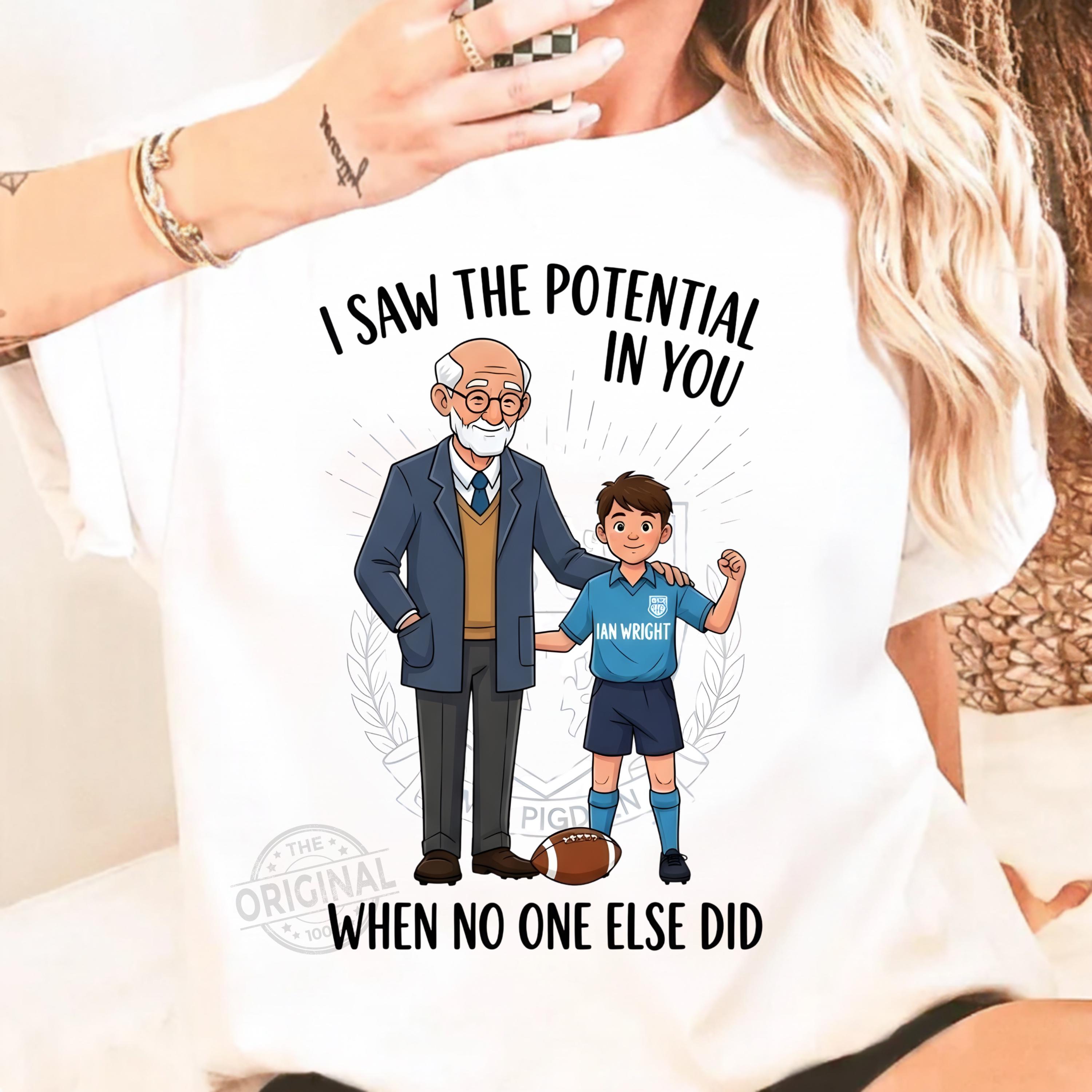 Celebrate the power of mentorship with this unique, inspirational t-shirt featuring Mr. Pigden, the legendary teacher who changed young Ian Wright’s life. This design shows a proud, wise teacher standing beside a young footballer, with the motivational quote: 'I saw potential in you when no one else did.' Perfect for football fans, teachers, mentors, or anyone who believes in the impact of guidance and encouragement. Printed on a clean white background, this tee makes a thoughtful gift and a stylish addition to your wardrobe. Available in multiple sizes, ideal for screen printing