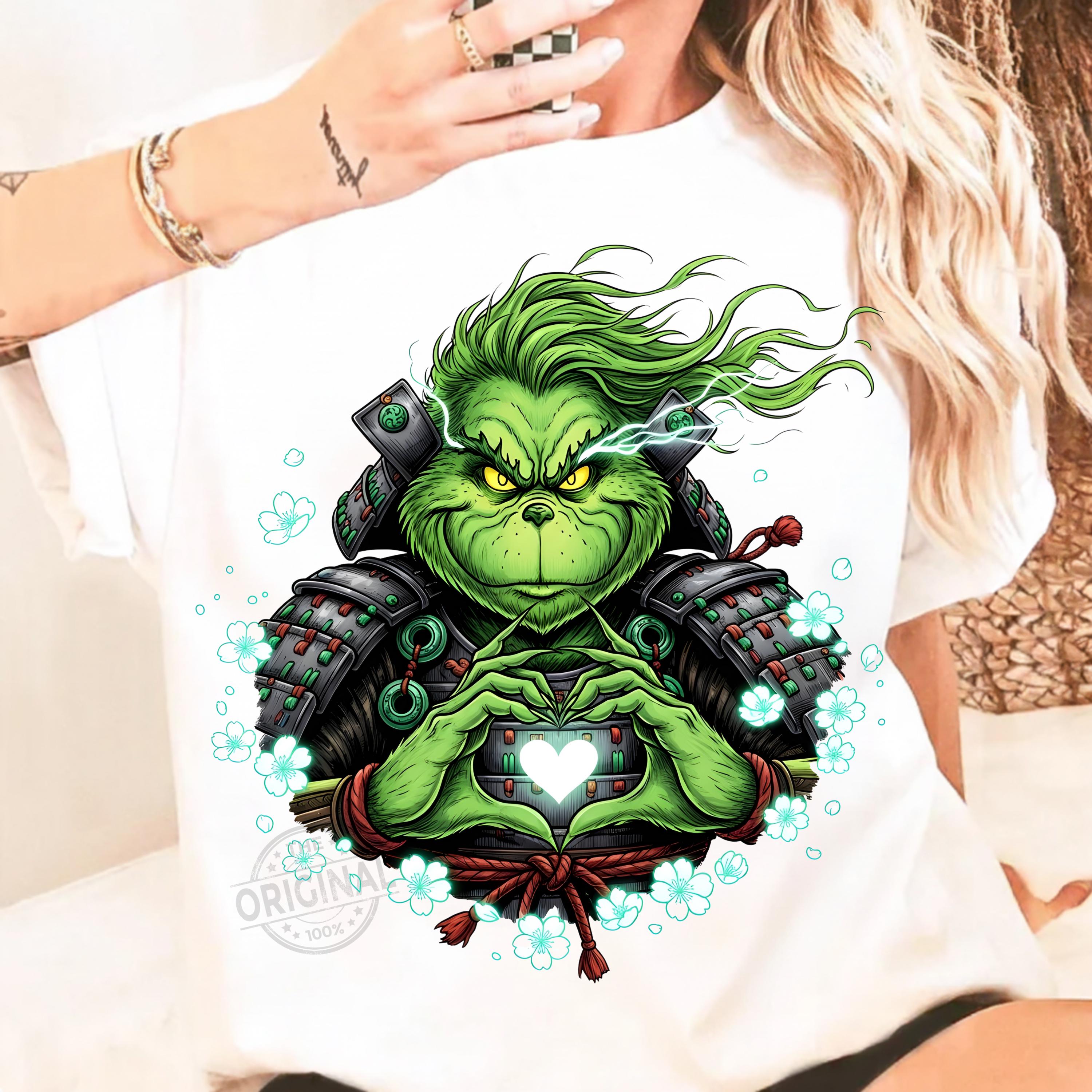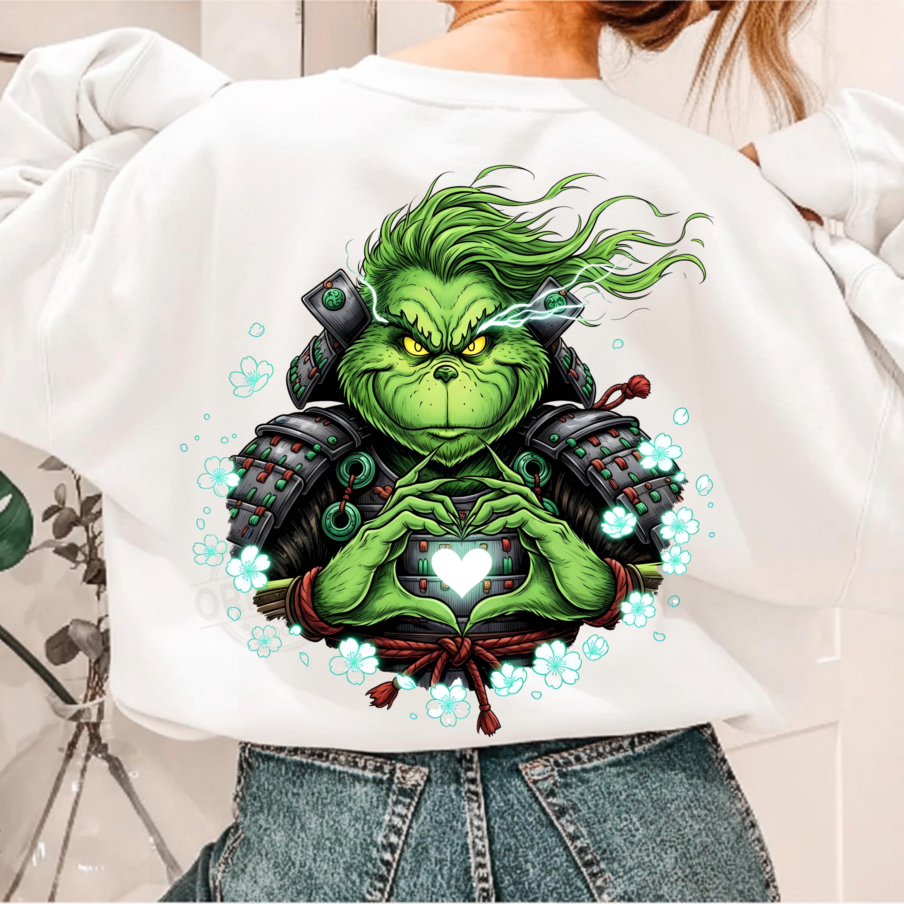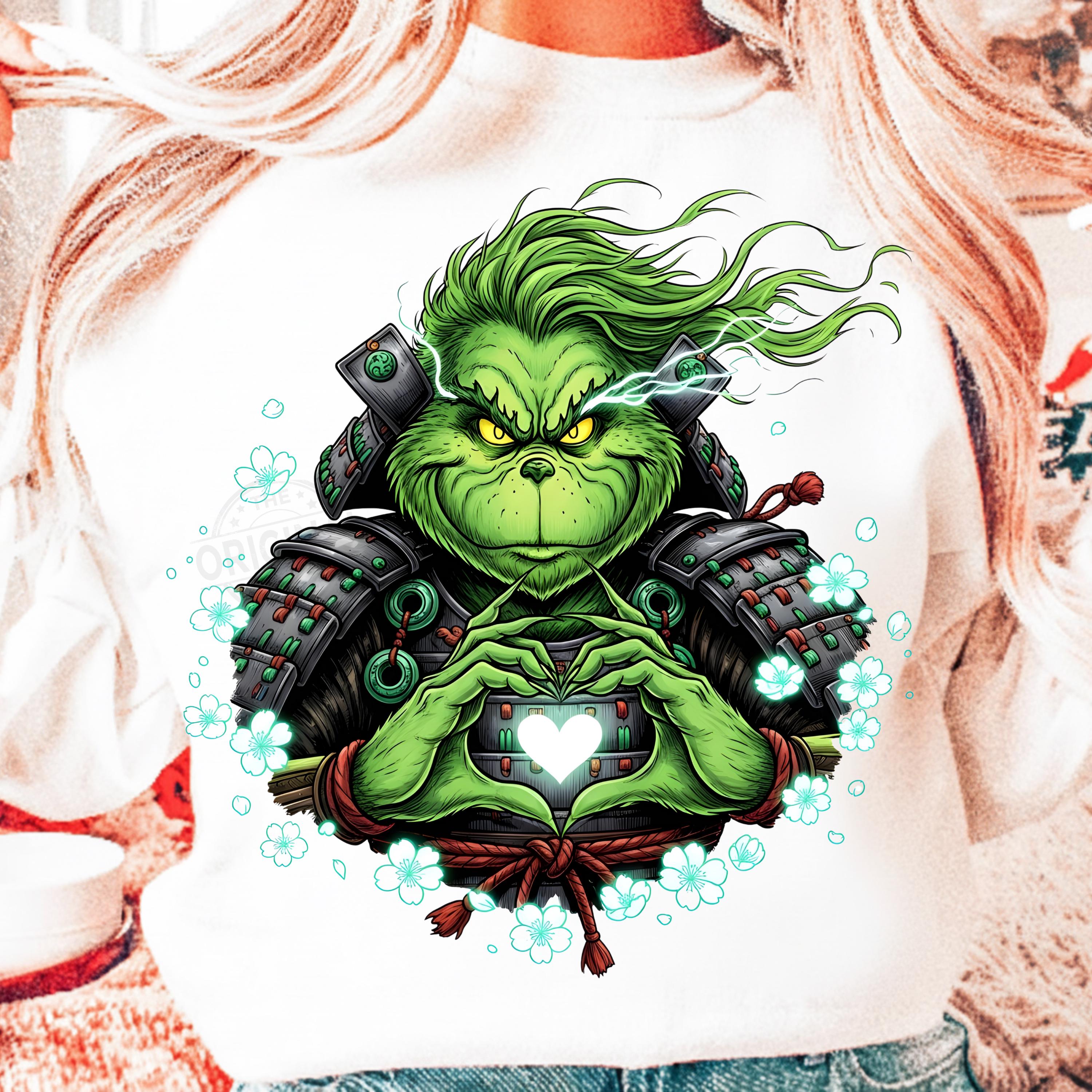 This high-resolution digital artwork shows the Grinch in detailed samurai armor forming a glowing heart – perfect for Christmas-themed projects with a unique Japanese twist.
