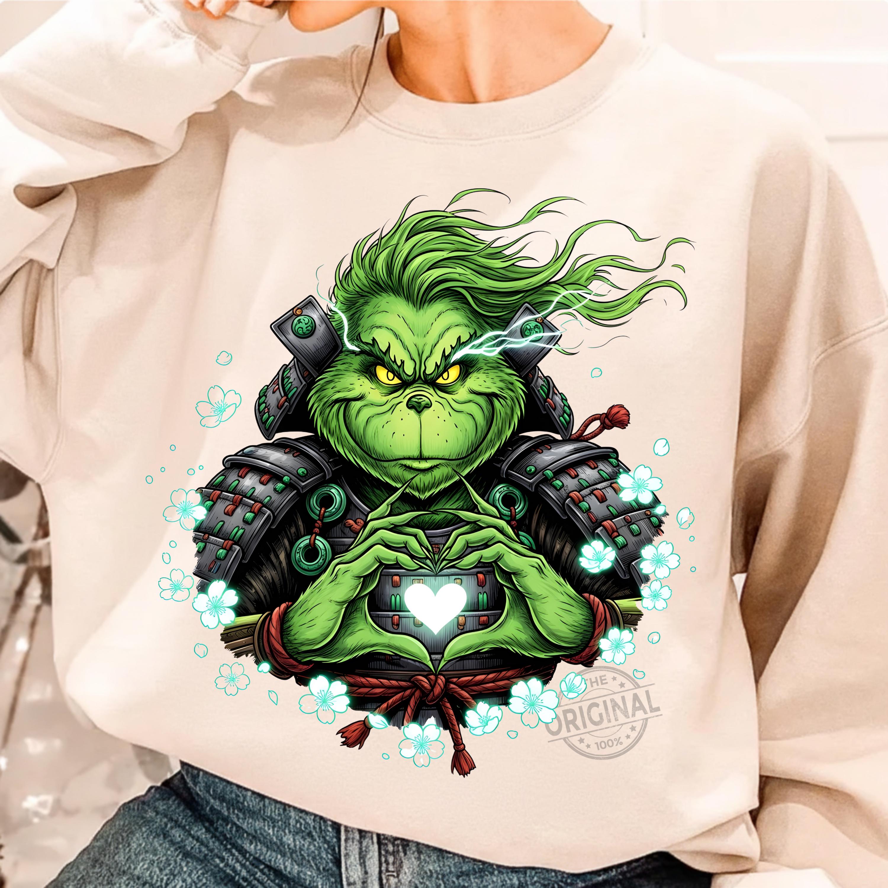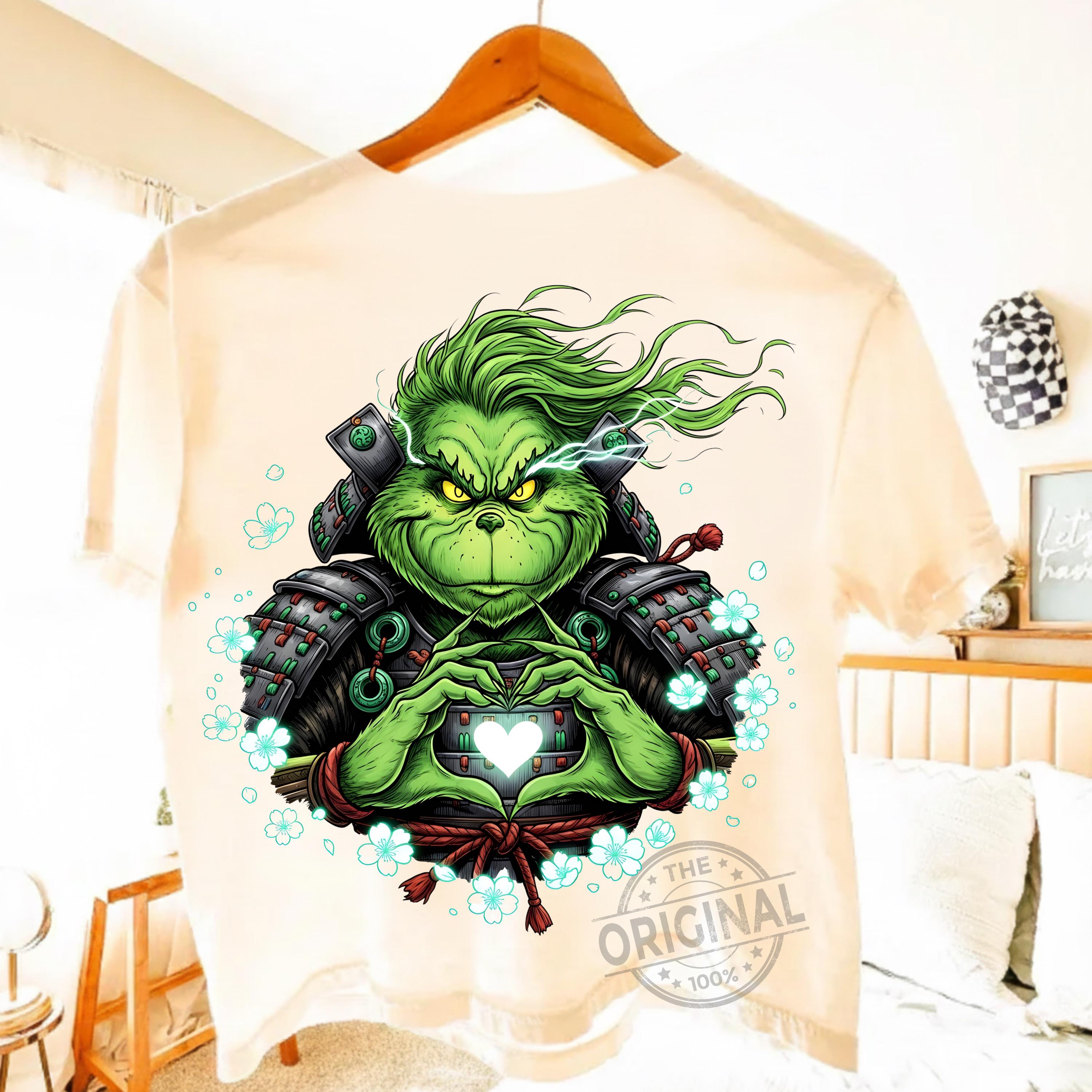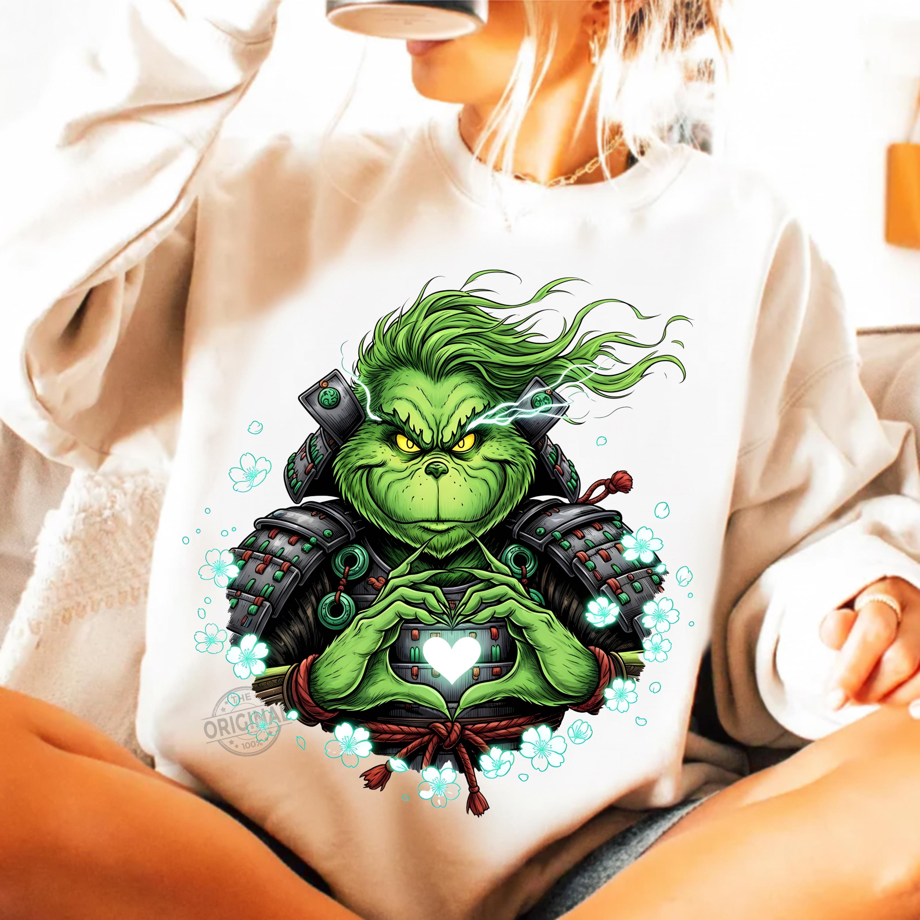 This high-resolution digital artwork shows the Grinch in detailed samurai armor forming a glowing heart – perfect for Christmas-themed projects with a unique Japanese twist.