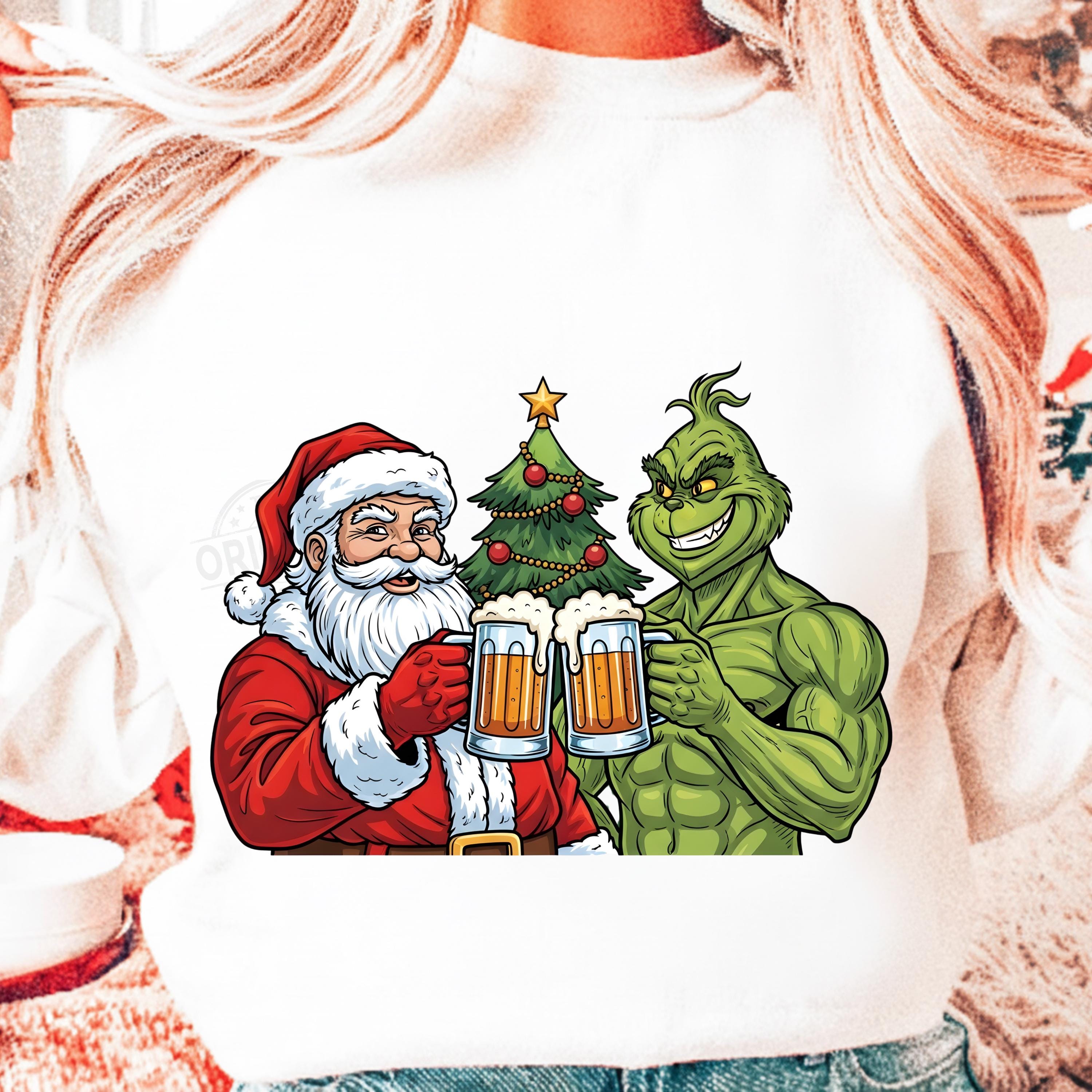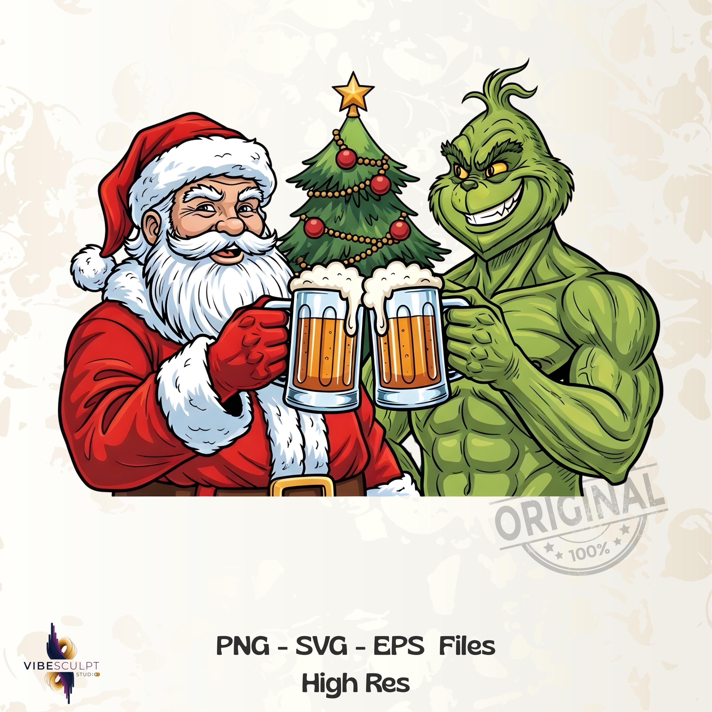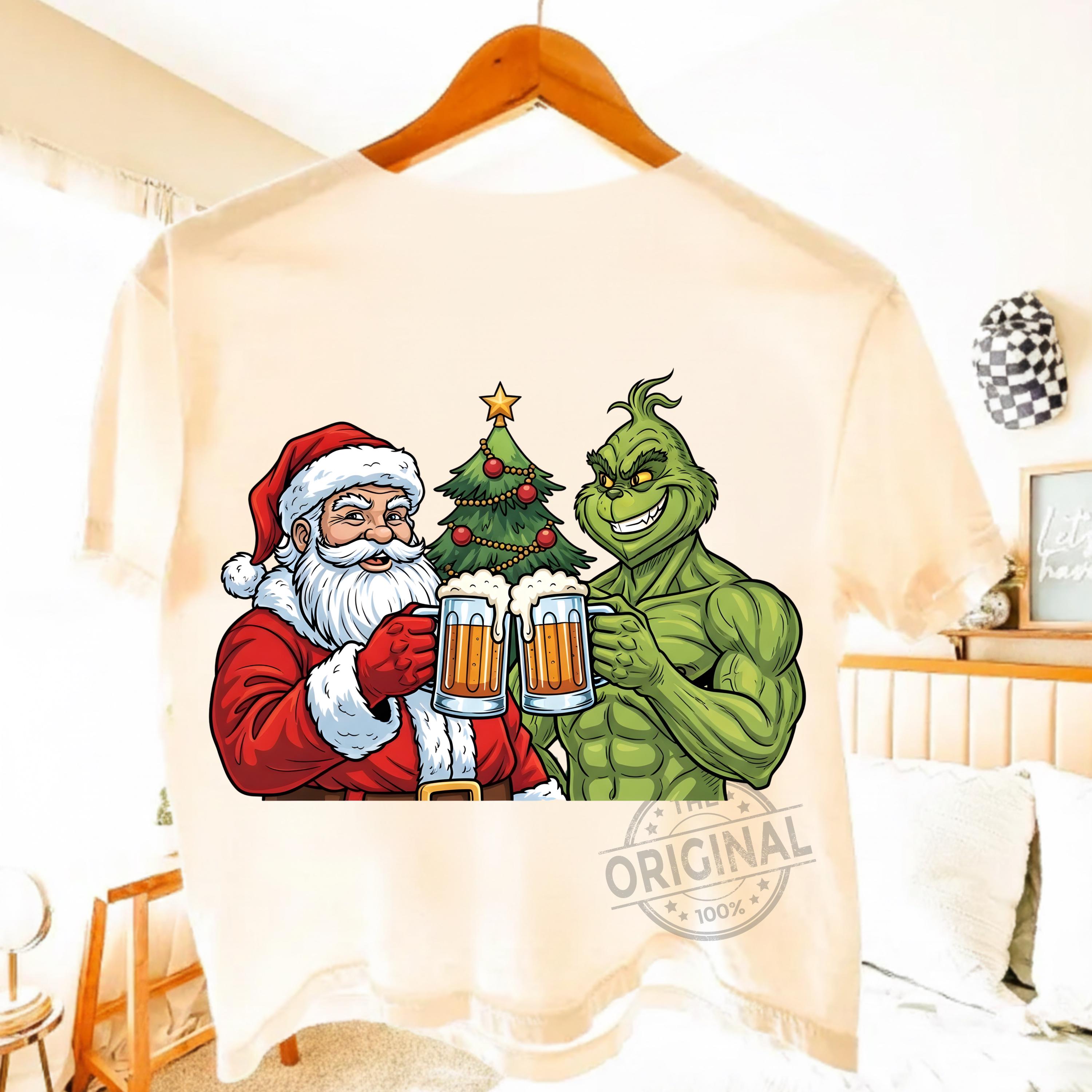 A cheerful and humorous Santa + Grinch beer toast illustration, drawn in ultra-detailed cartoon style. This premium artwork includes crisp outlines, detailed textures, expressive characters, and a clean white background optimized for apparel design.
