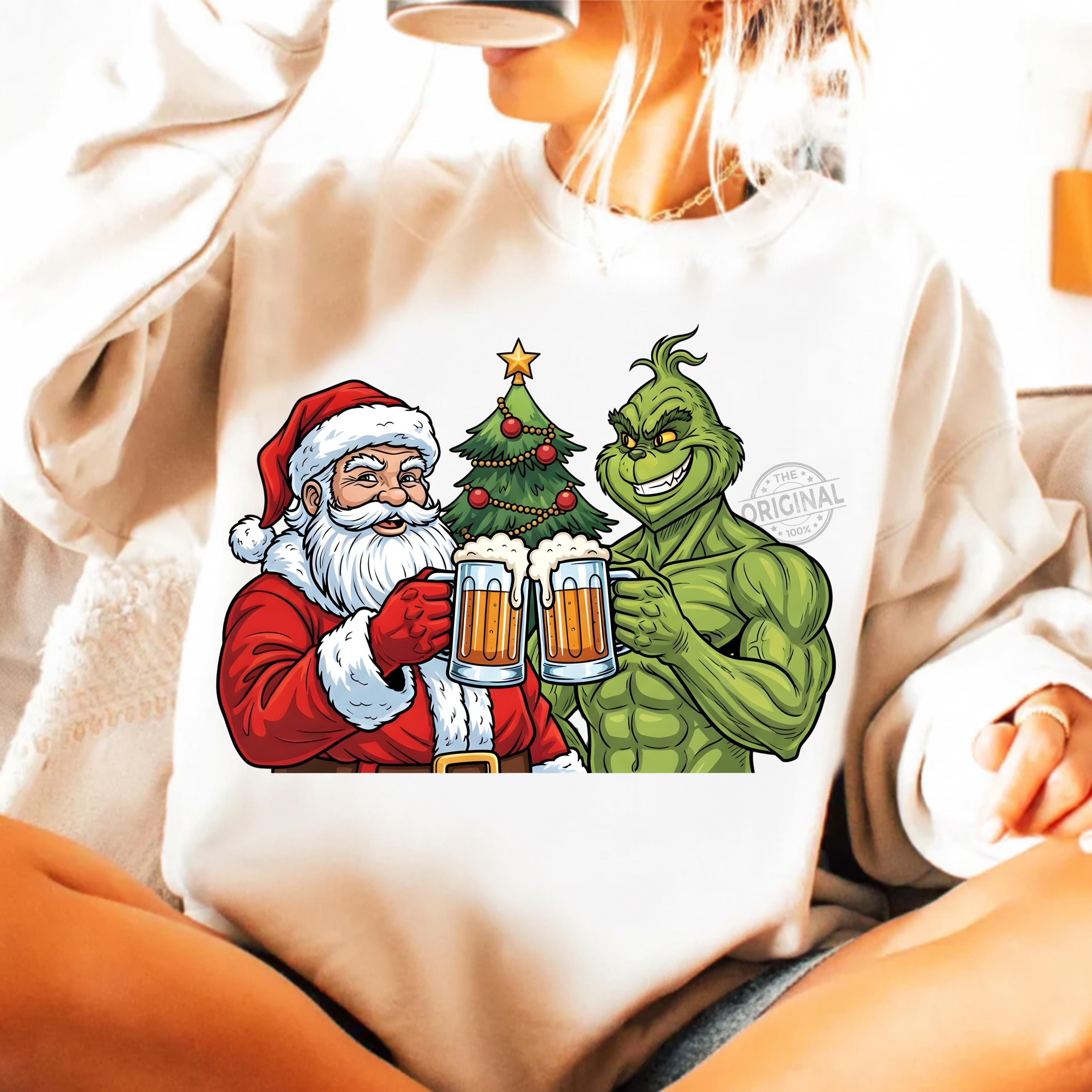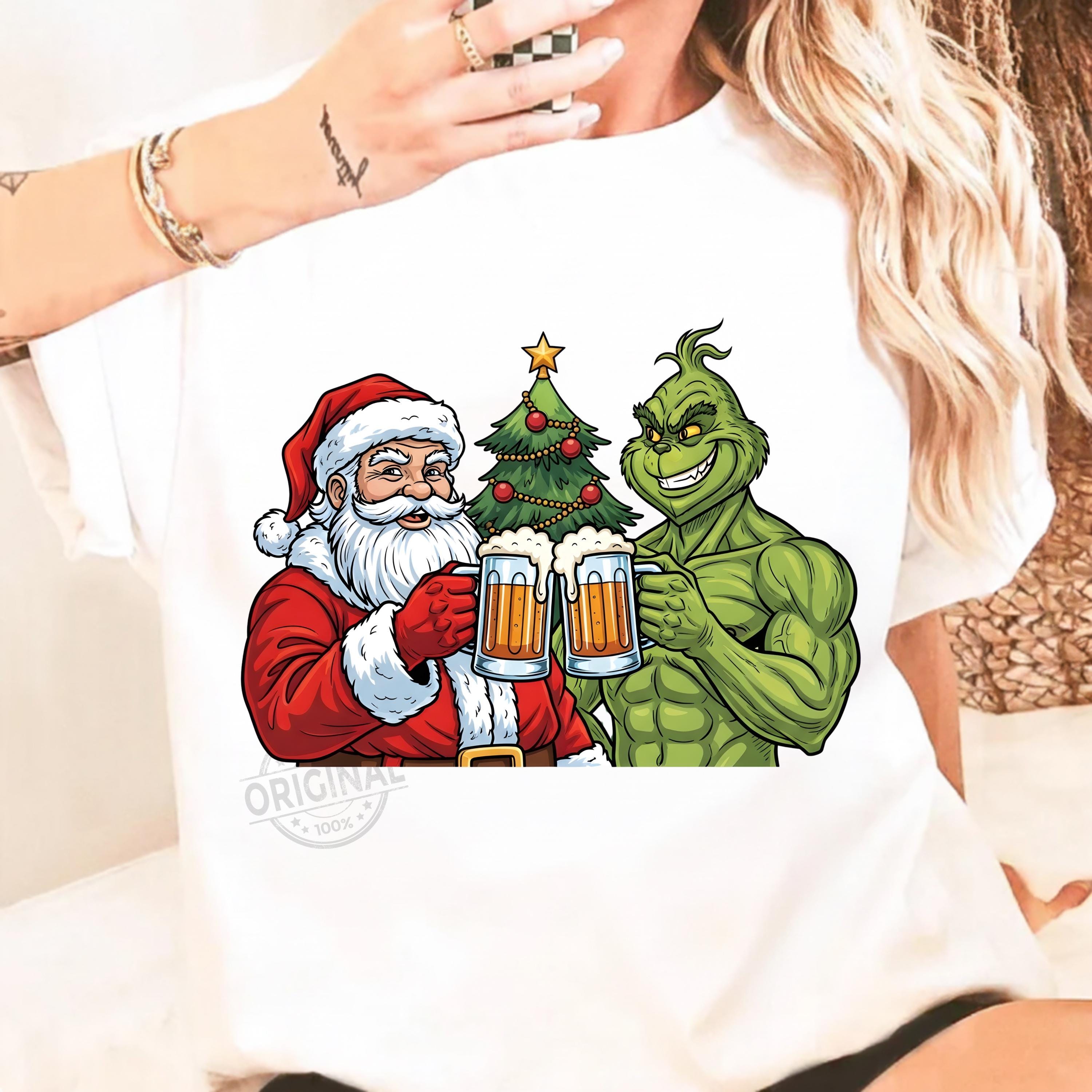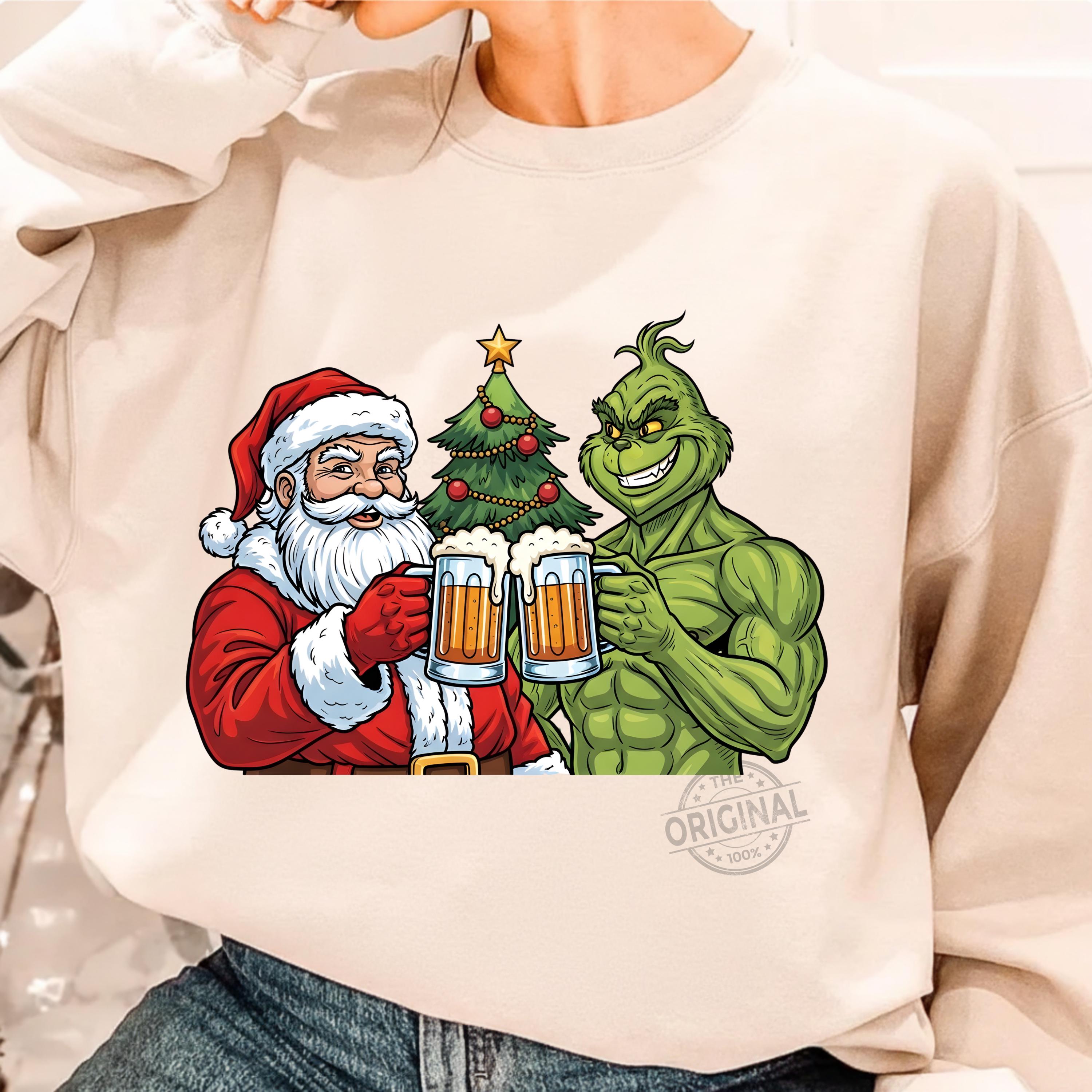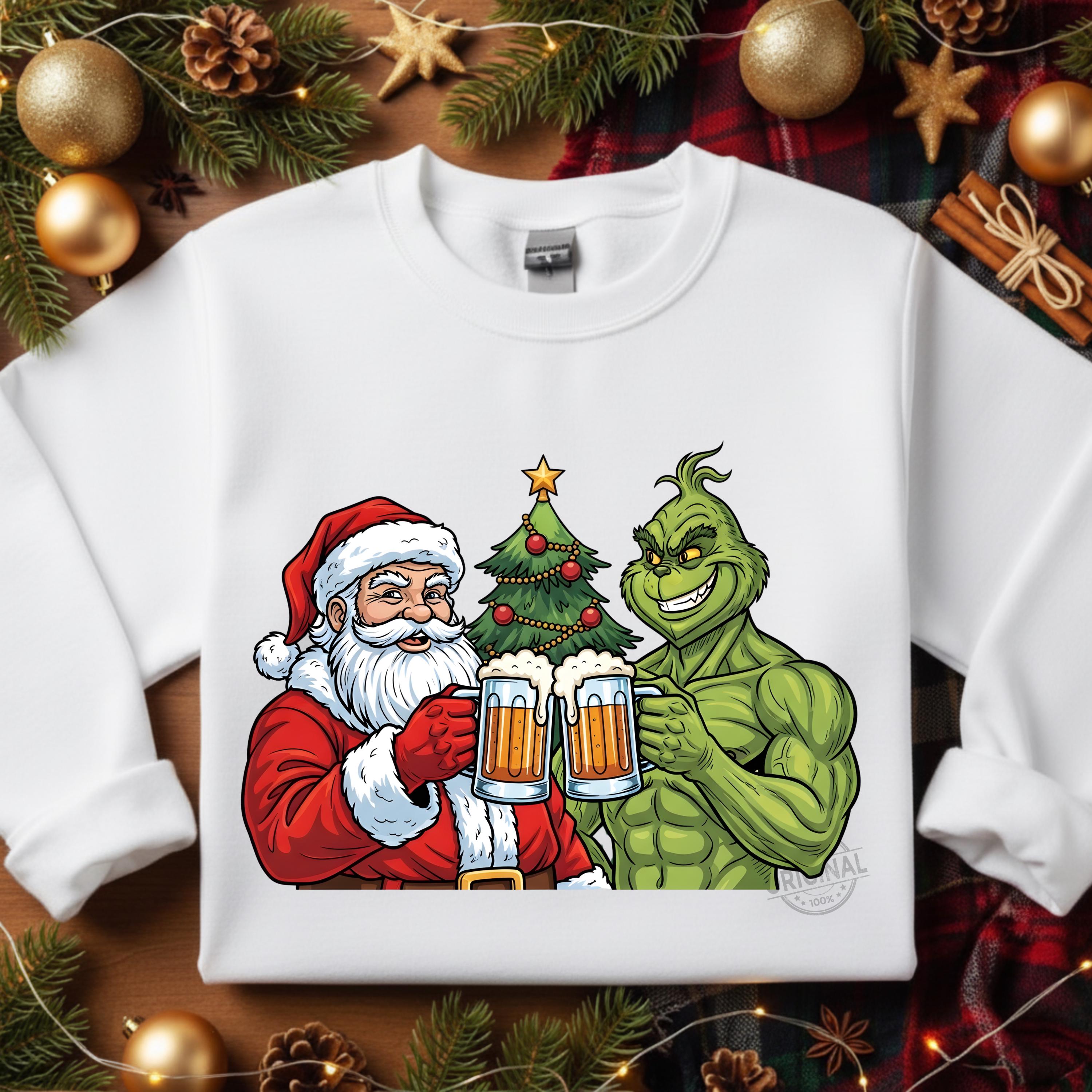 A cheerful and humorous Santa + Grinch beer toast illustration, drawn in ultra-detailed cartoon style. This premium artwork includes crisp outlines, detailed textures, expressive characters, and a clean white background optimized for apparel design.
