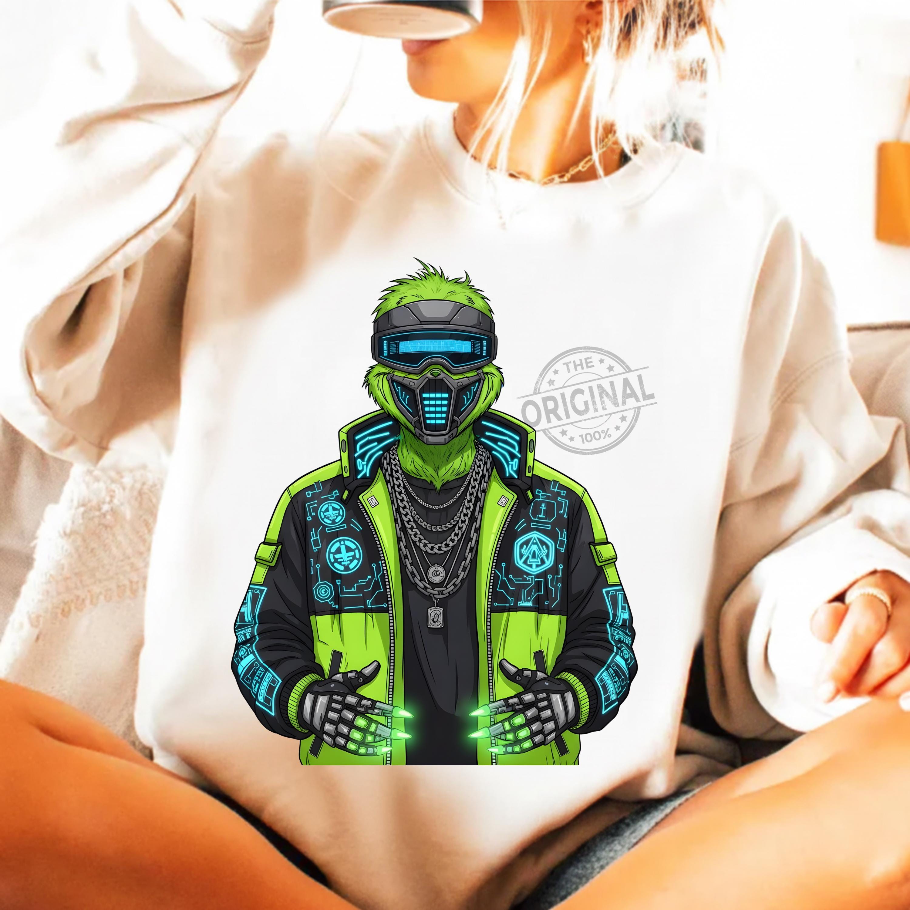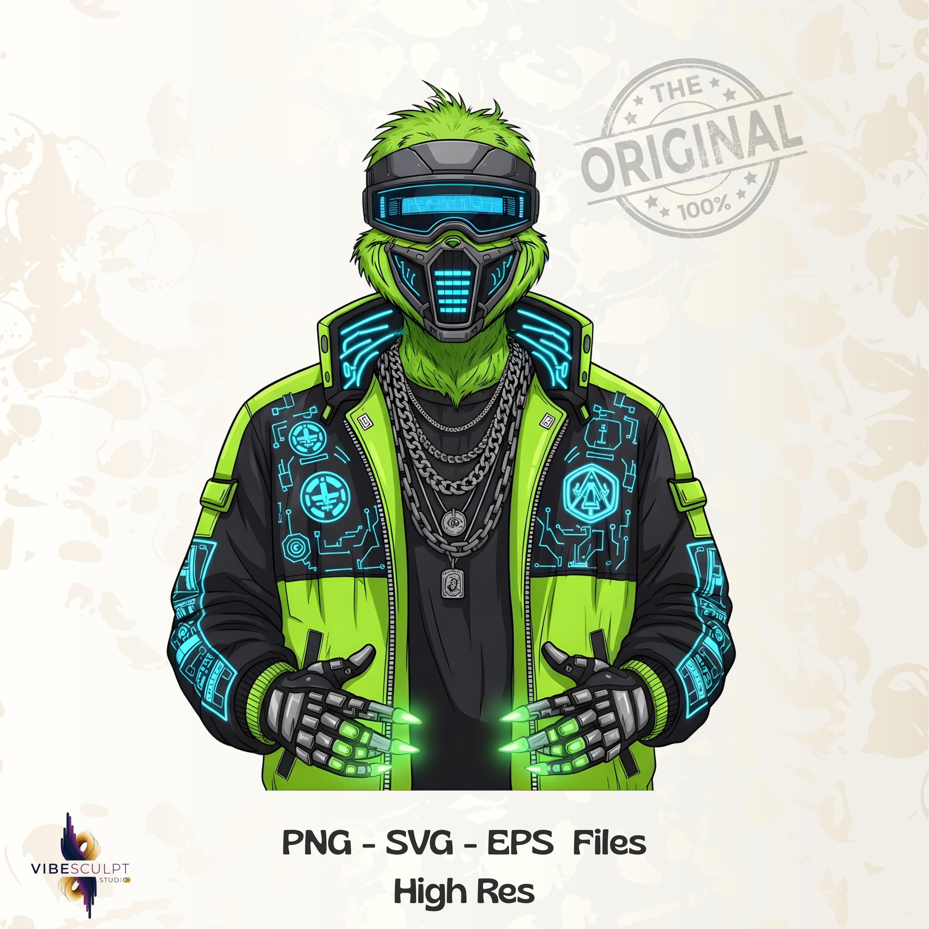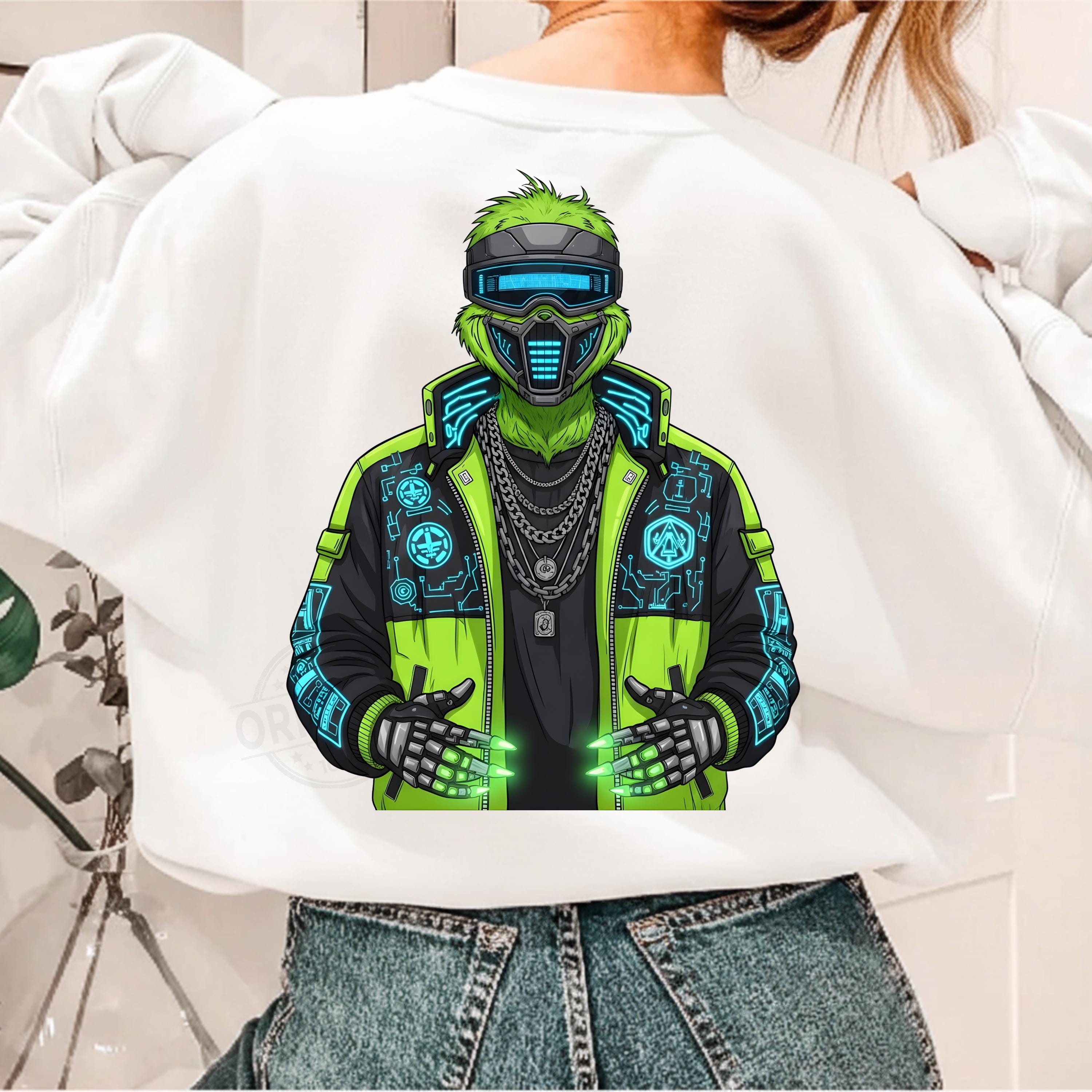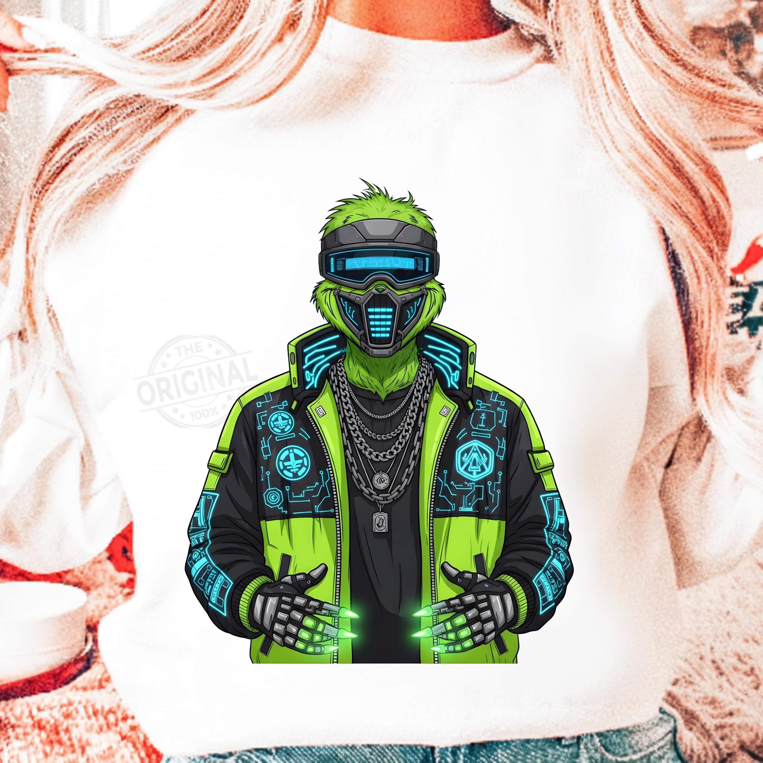 This Mecha Grinch artwork shows the iconic character transformed into a full armored sci-fi warrior. Strong metallic textures, glowing elements, and mechanical details create a unique Christmas design perfect for t-shirts and hoodies. Ideal for fans of futuristic artwork and holiday apparel. High-resolution and print-ready for clothing.