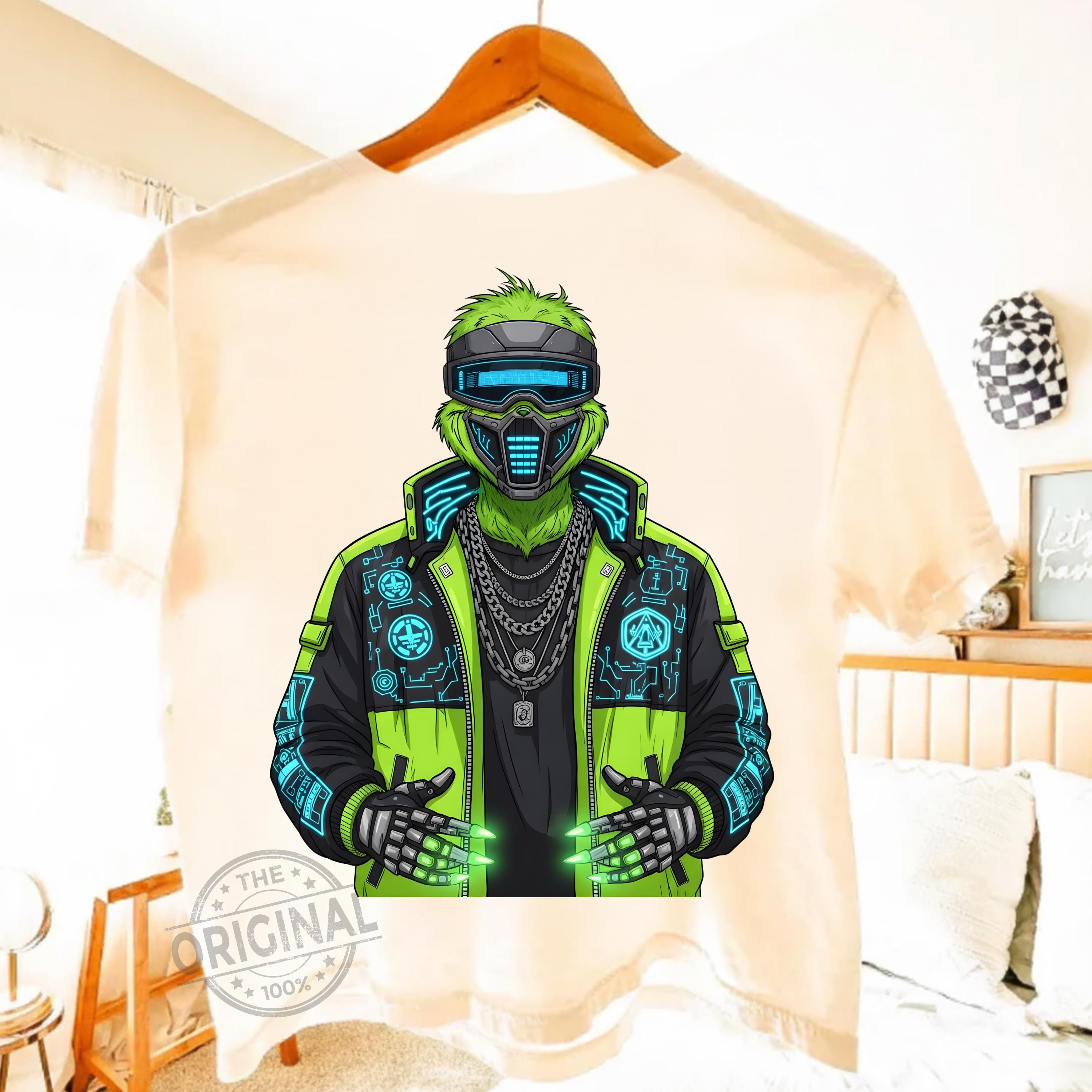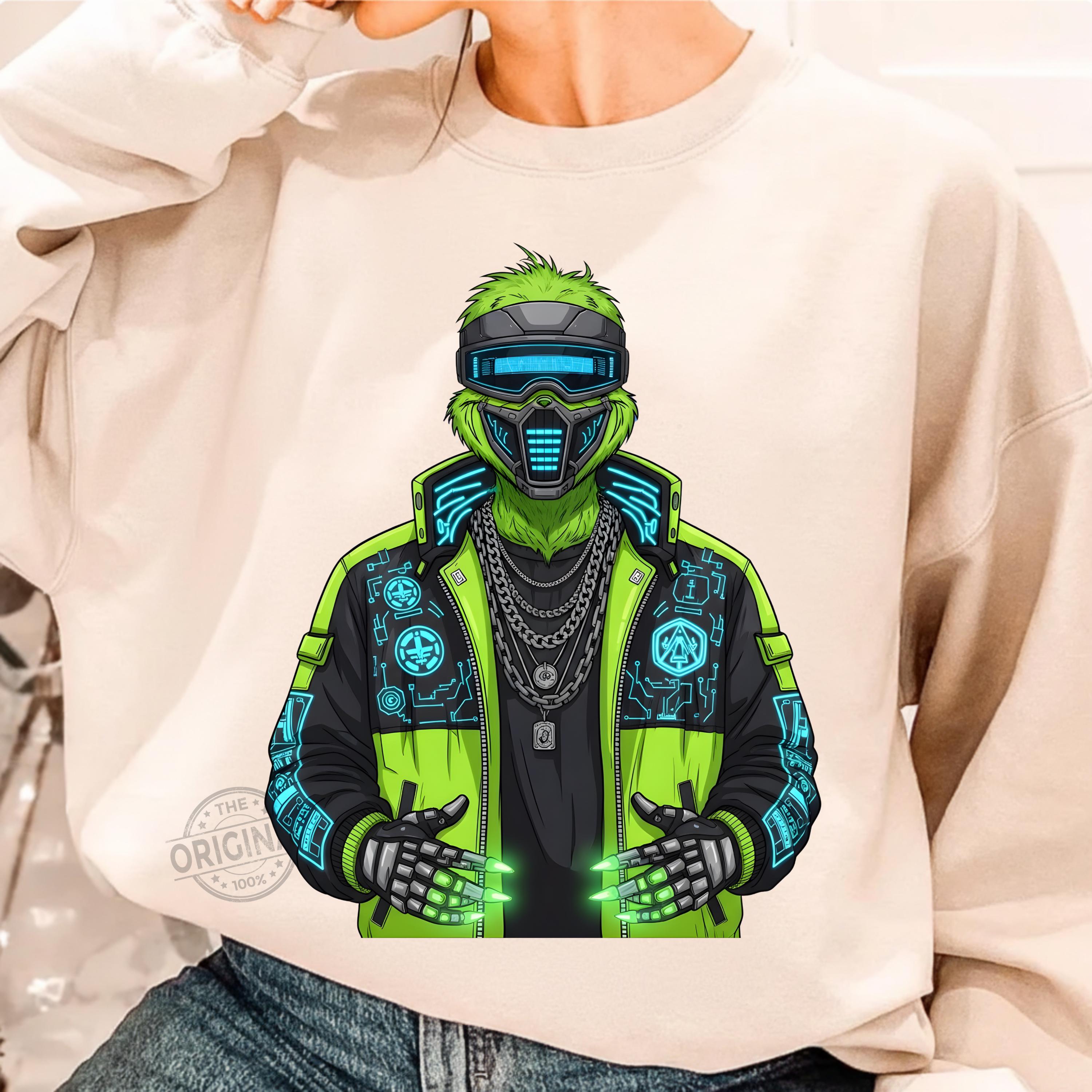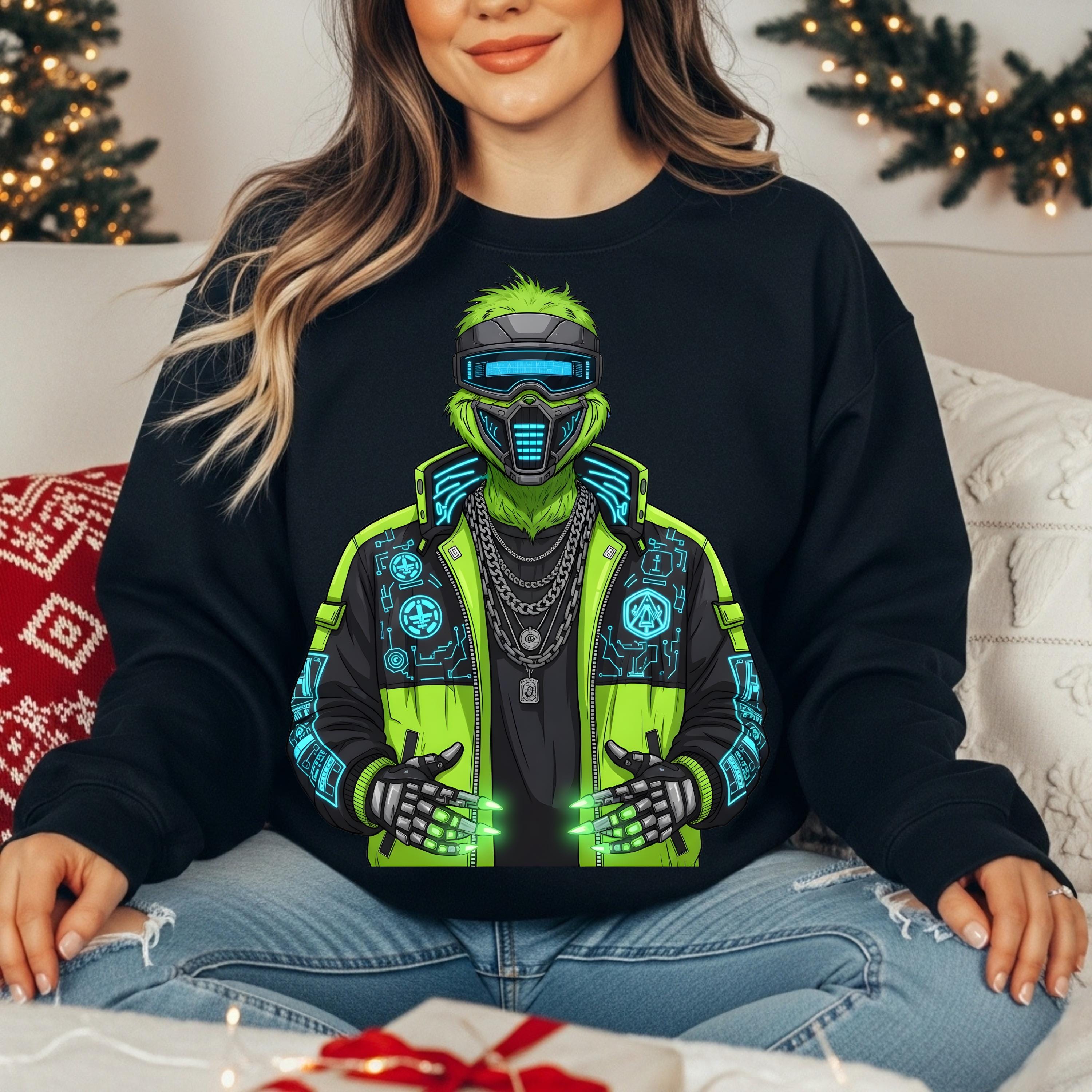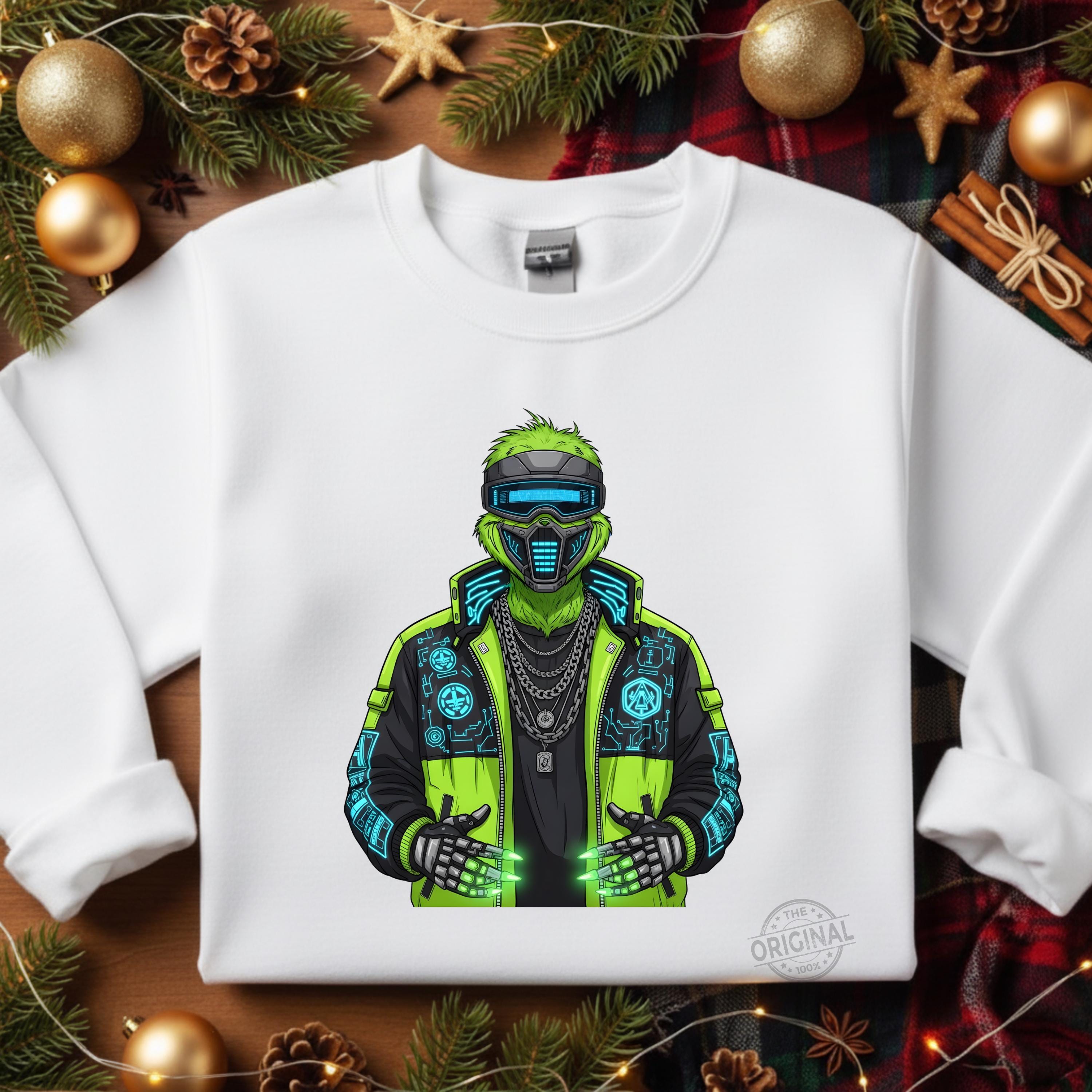 This Mecha Grinch artwork shows the iconic character transformed into a full armored sci-fi warrior. Strong metallic textures, glowing elements, and mechanical details create a unique Christmas design perfect for t-shirts and hoodies. Ideal for fans of futuristic artwork and holiday apparel. High-resolution and print-ready for clothing.