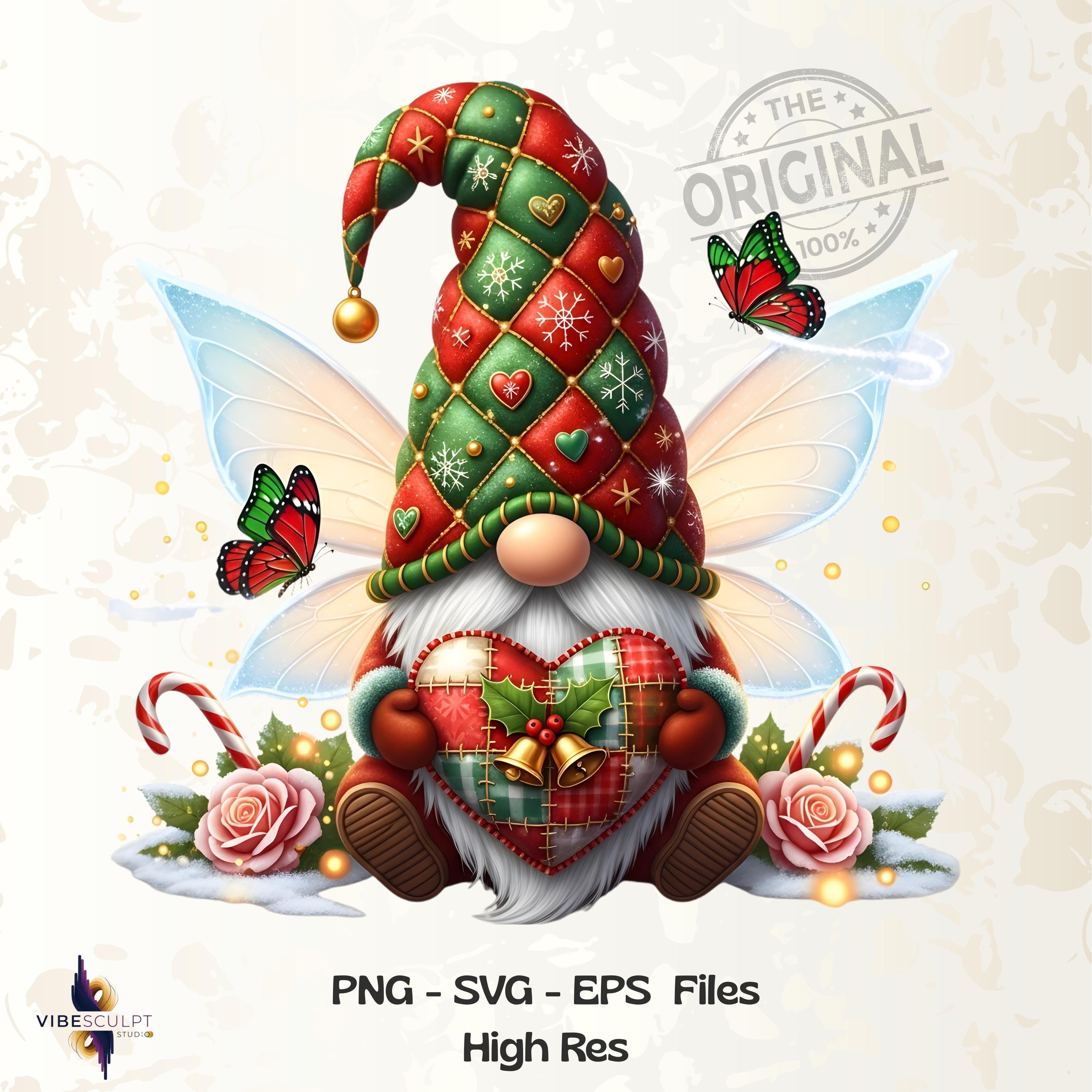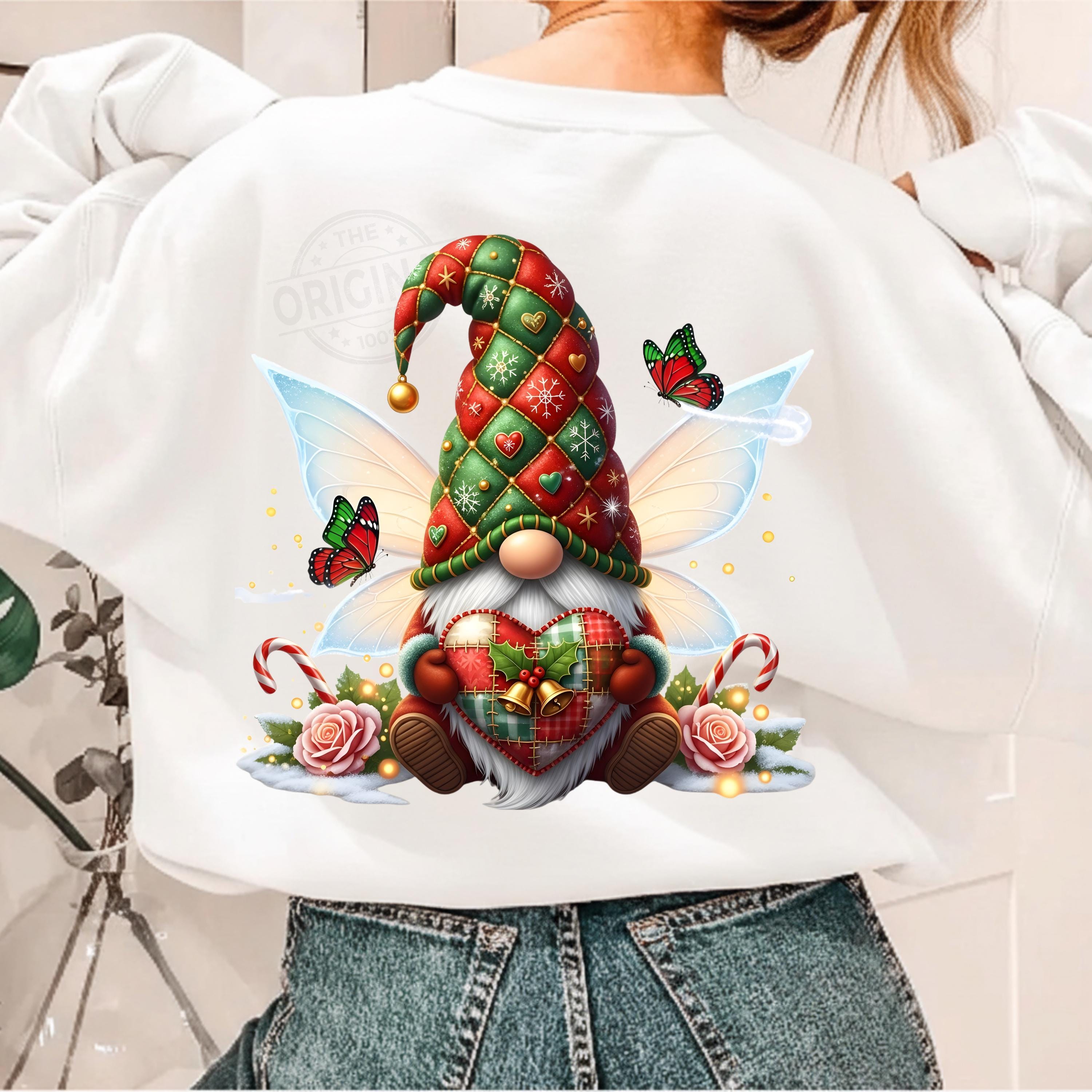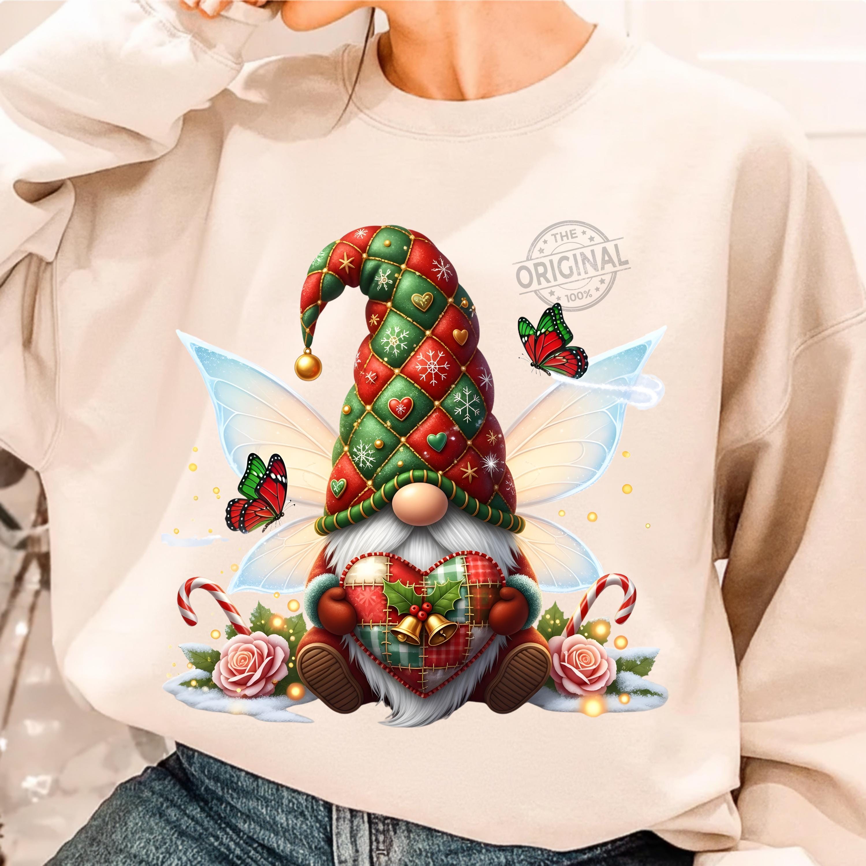A festive Christmas gnome with frosty fairy wings, glowing butterflies and a patchwork winter hat. Ultra-detailed textures, soft sparkles, snowy atmosphere and a cozy magical feel.