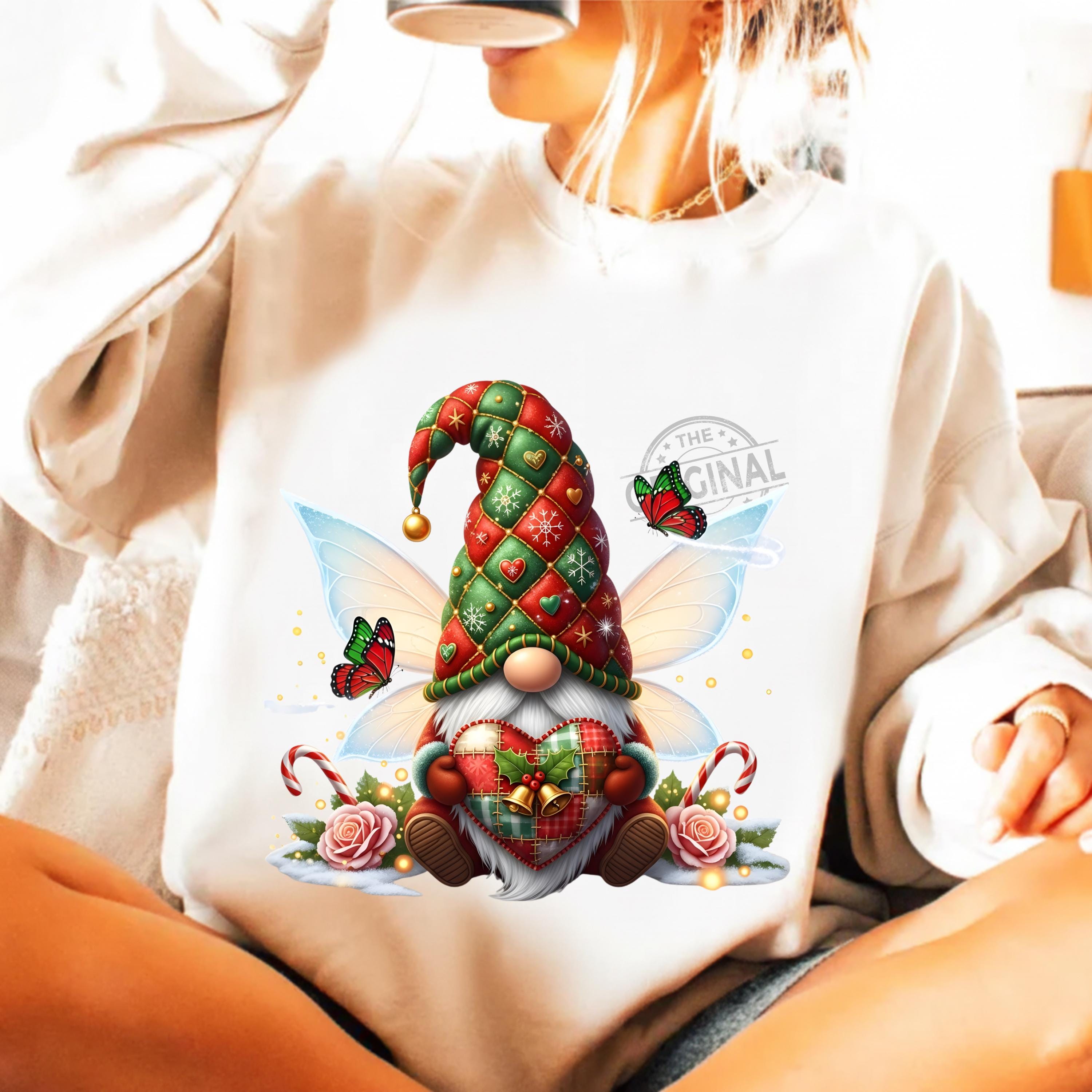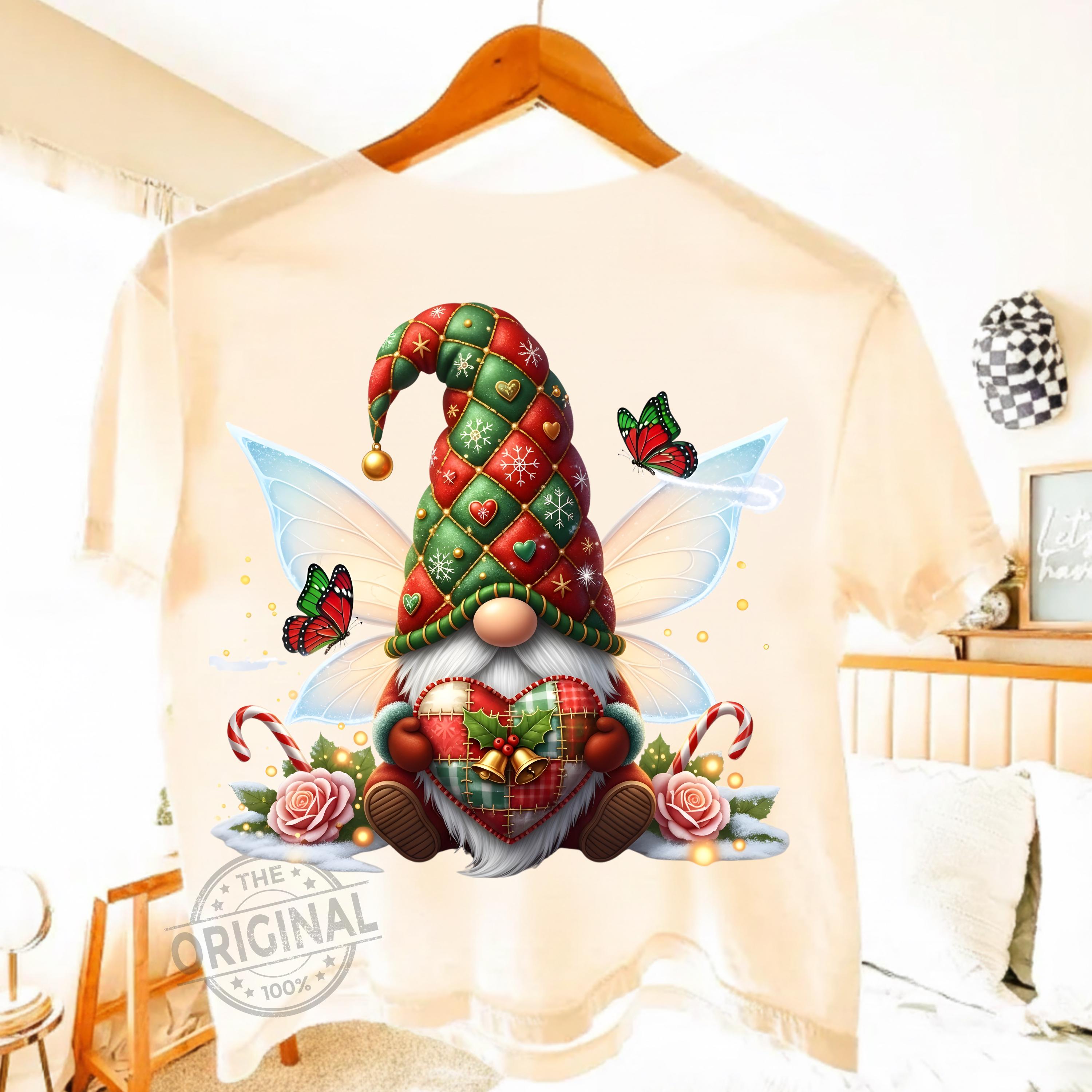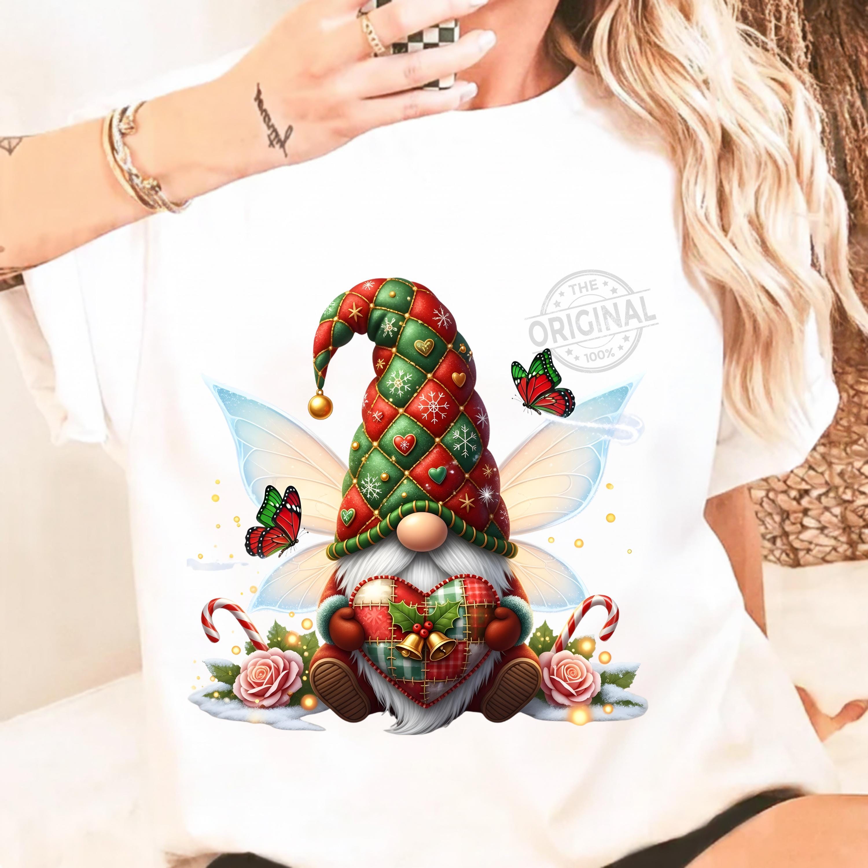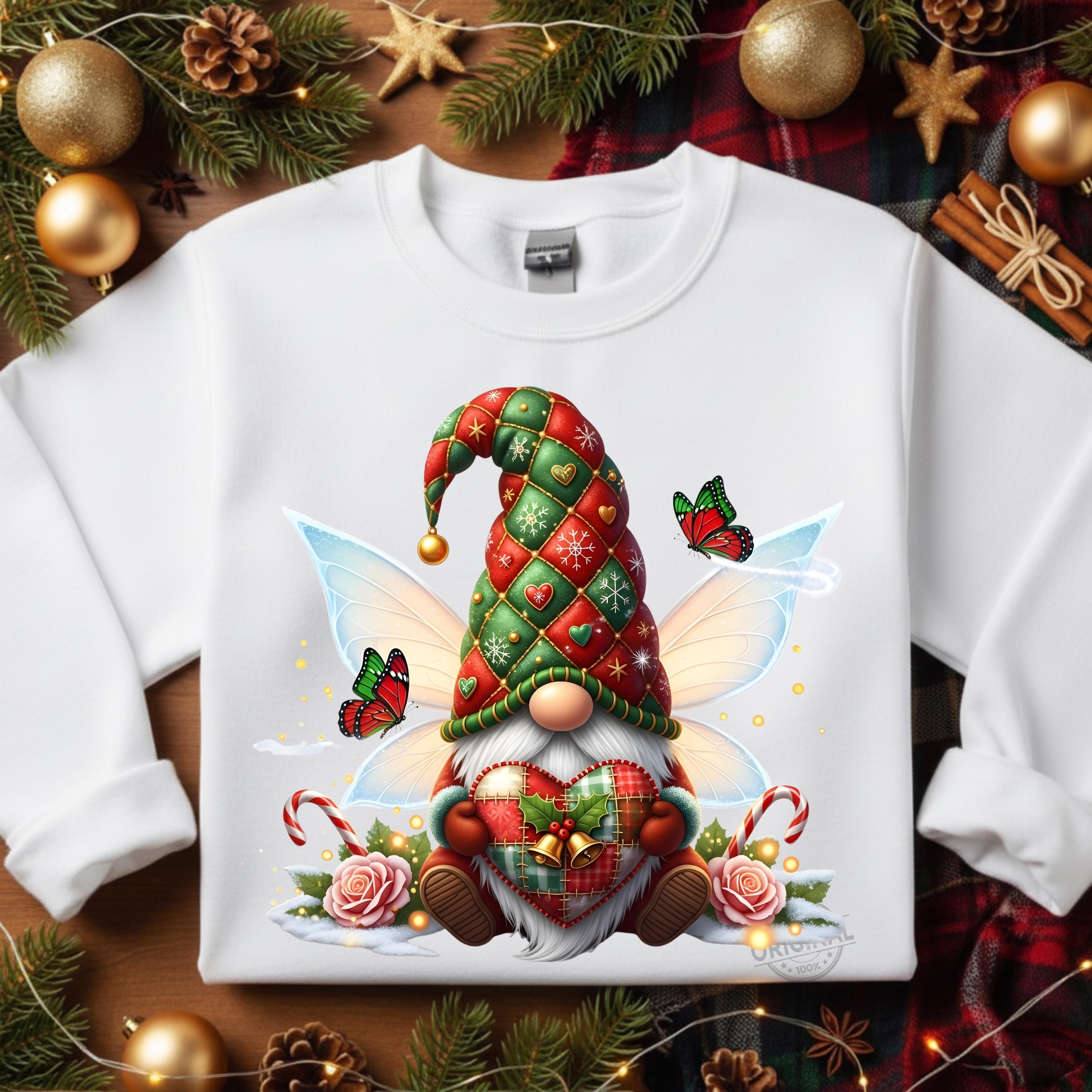 A festive Christmas gnome with frosty fairy wings, glowing butterflies and a patchwork winter hat. Ultra-detailed textures, soft sparkles, snowy atmosphere and a cozy magical feel.