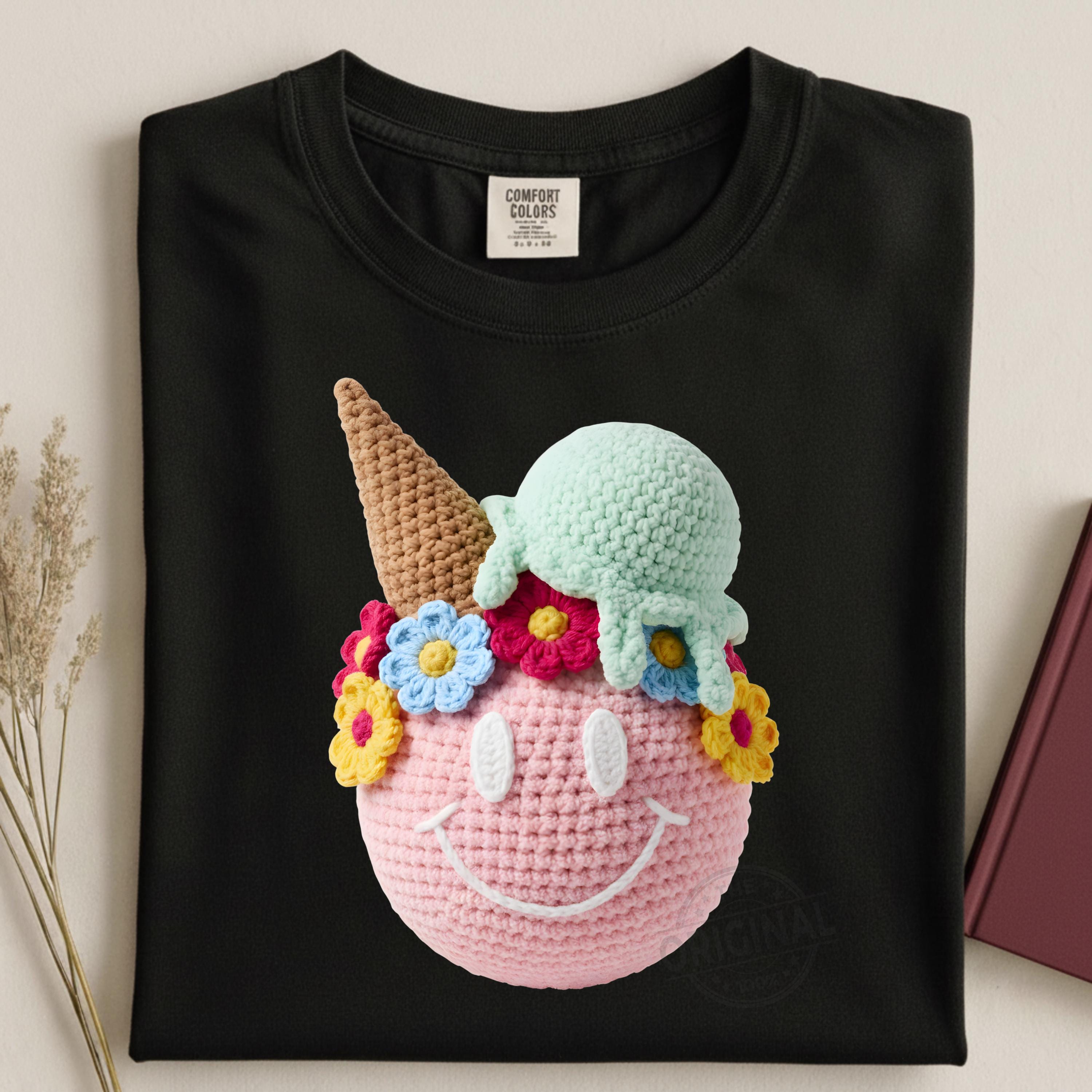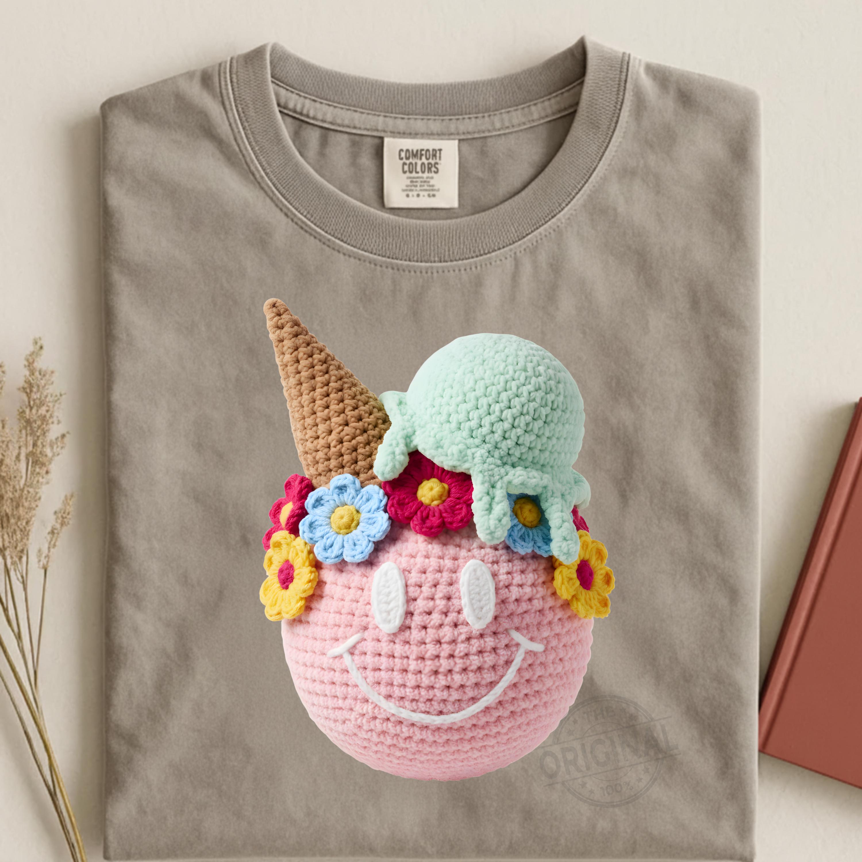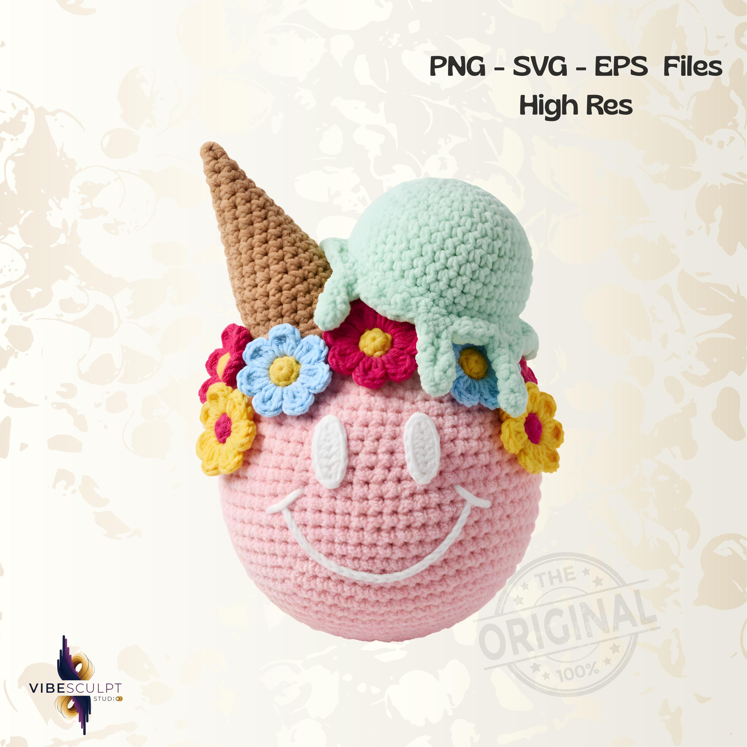 The Cute Ice Cream Smiley Yarn PNG features a cheerful crochet face topped with a melting ice cream cone and colorful flowers. This sweet and uplifting design symbolizes joy, comfort, and self-love in a trendy kawaii style.