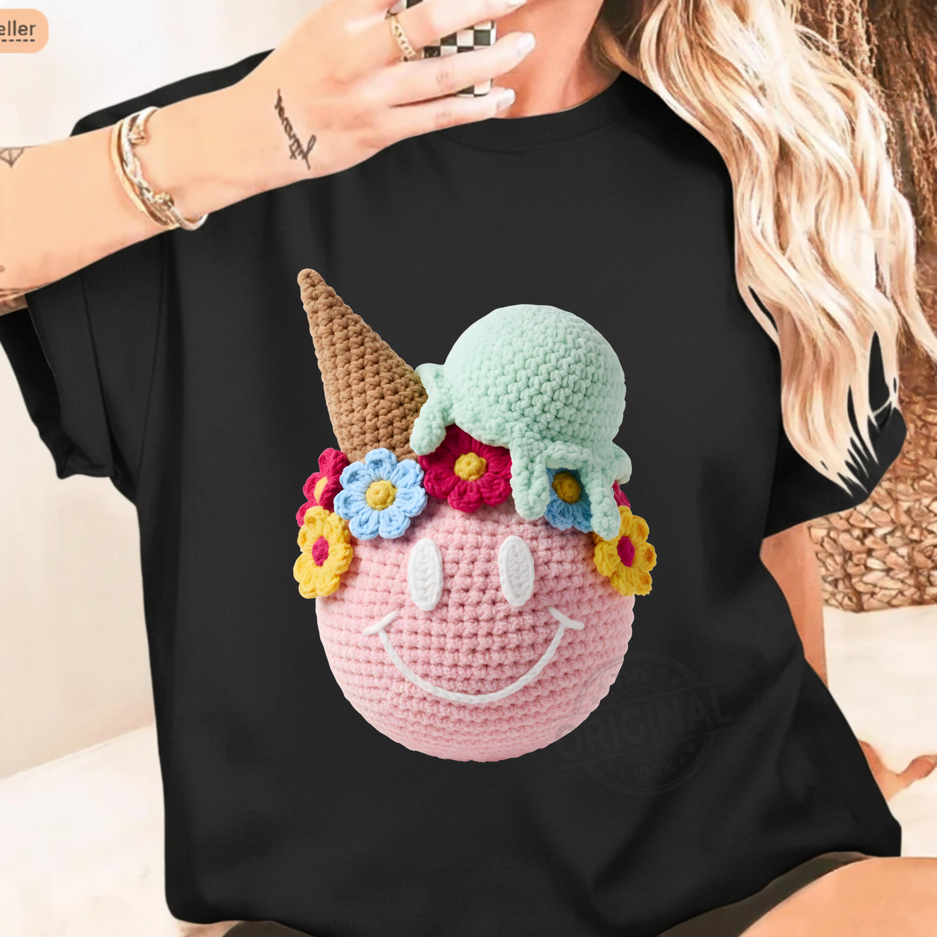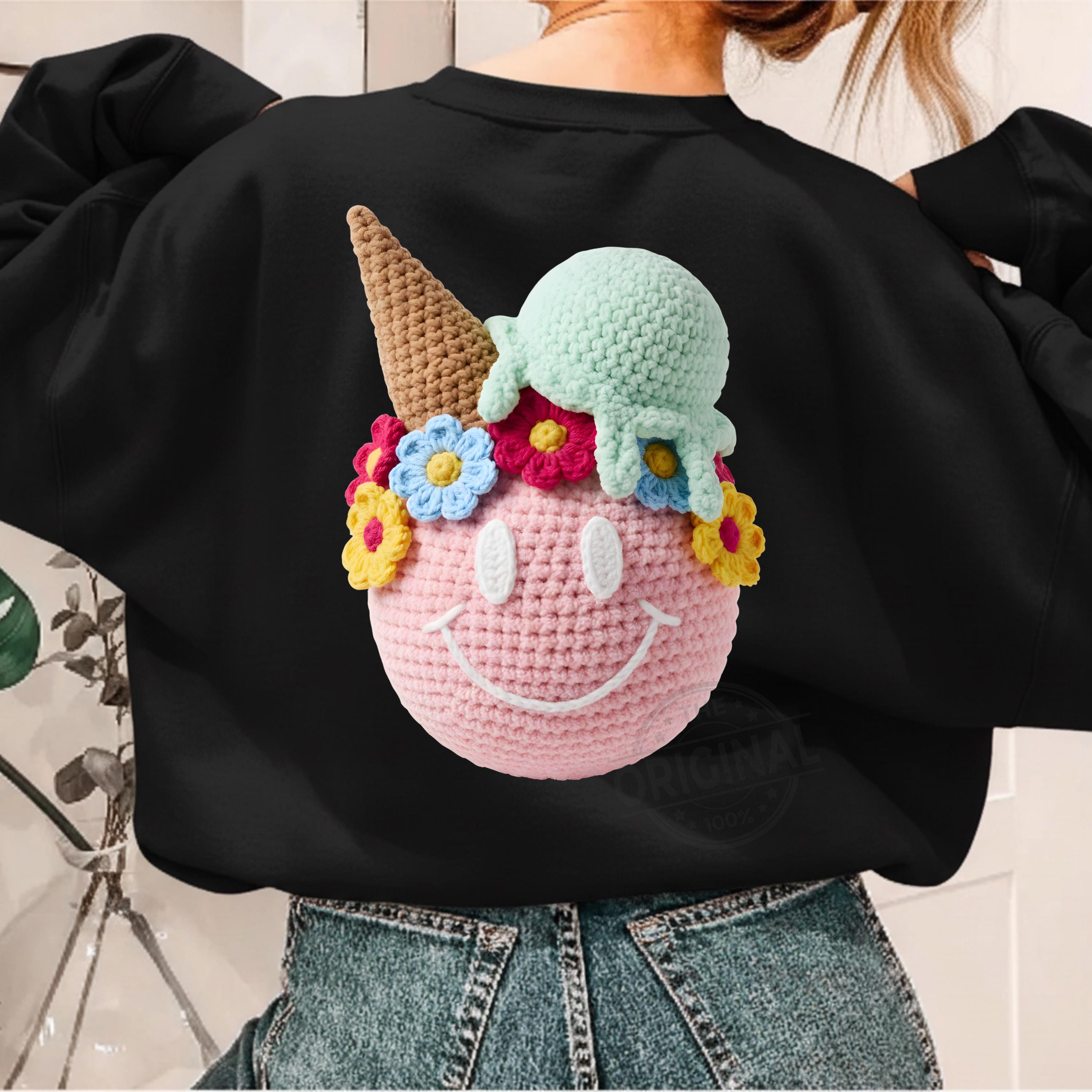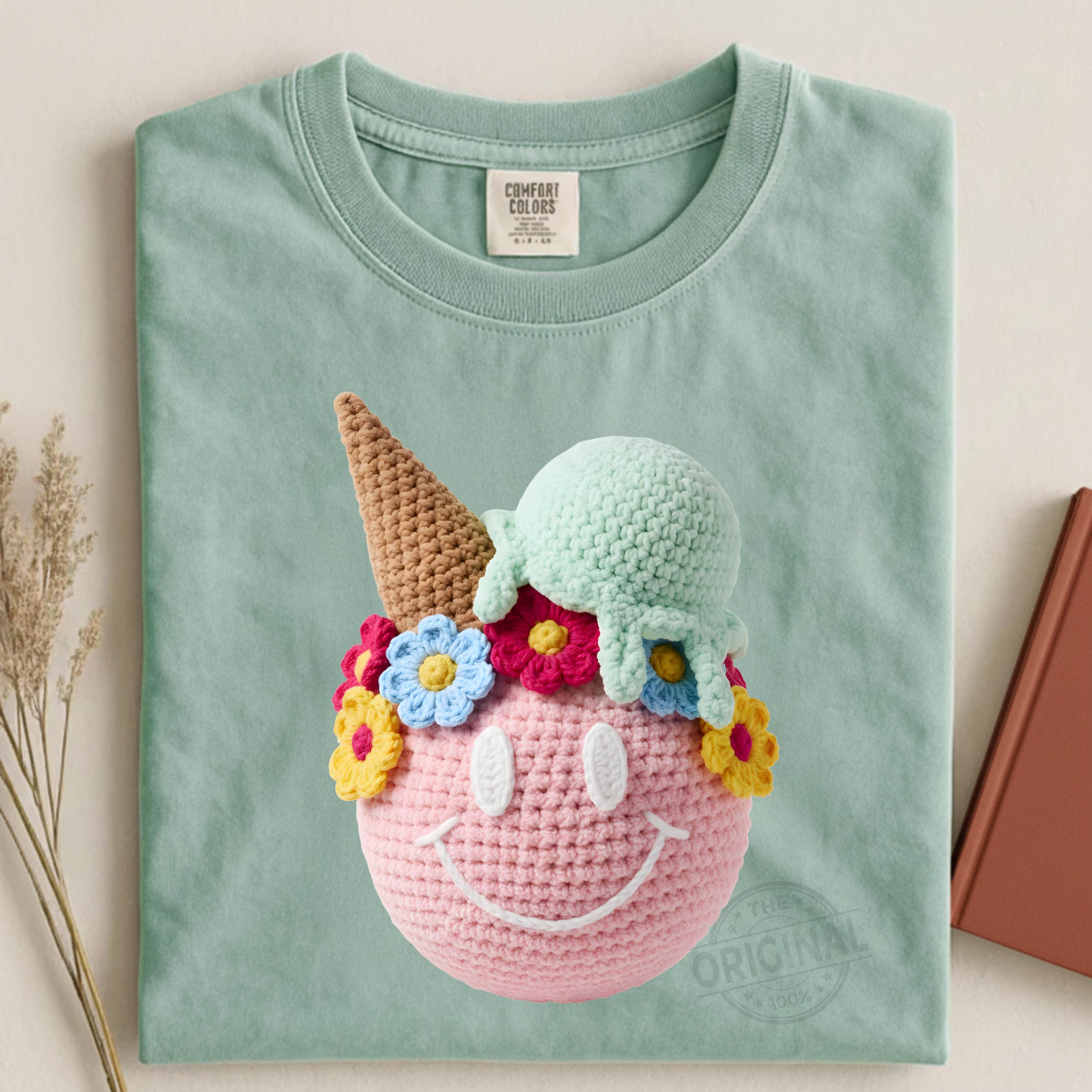 The Cute Ice Cream Smiley Yarn PNG features a cheerful crochet face topped with a melting ice cream cone and colorful flowers. This sweet and uplifting design symbolizes joy, comfort, and self-love in a trendy kawaii style.
