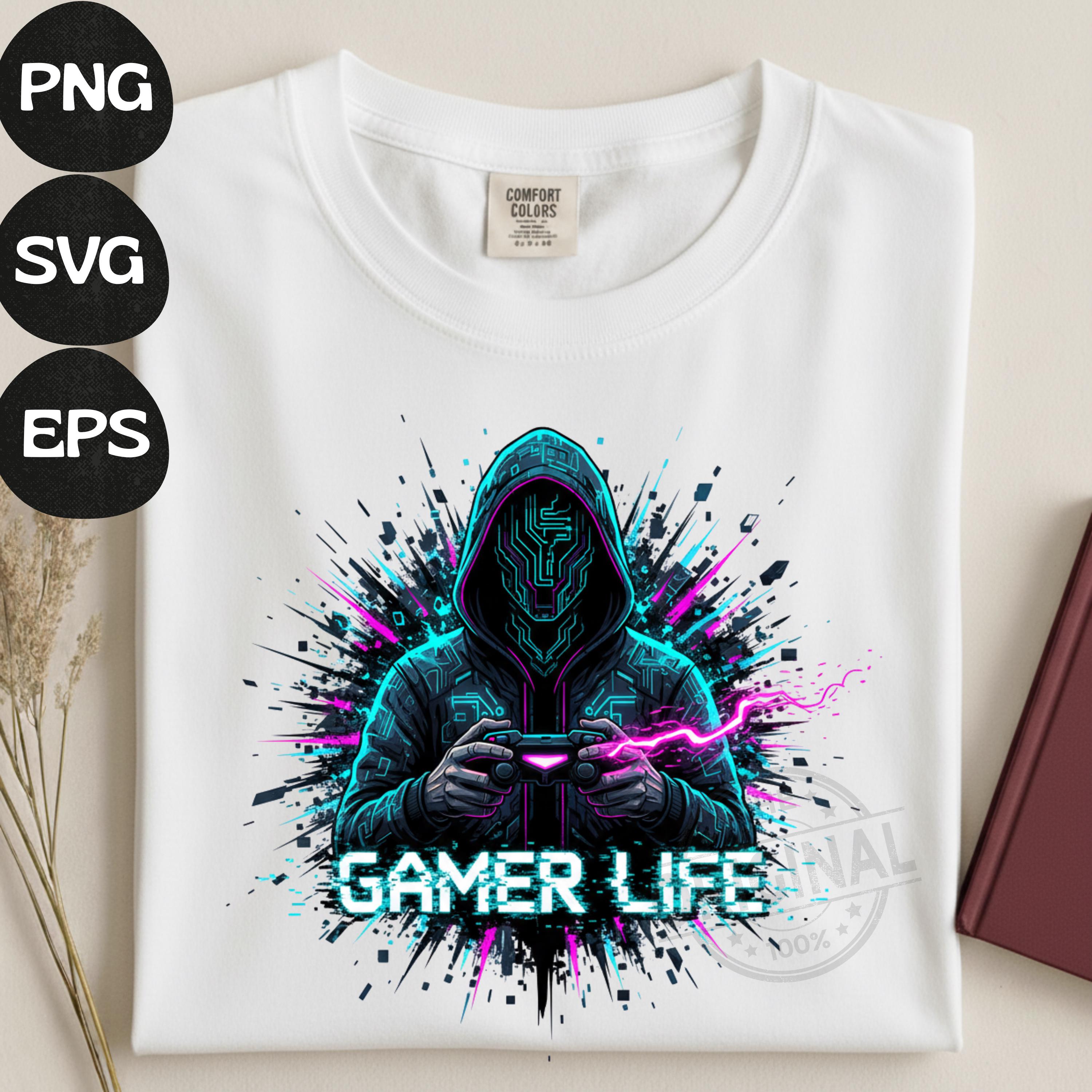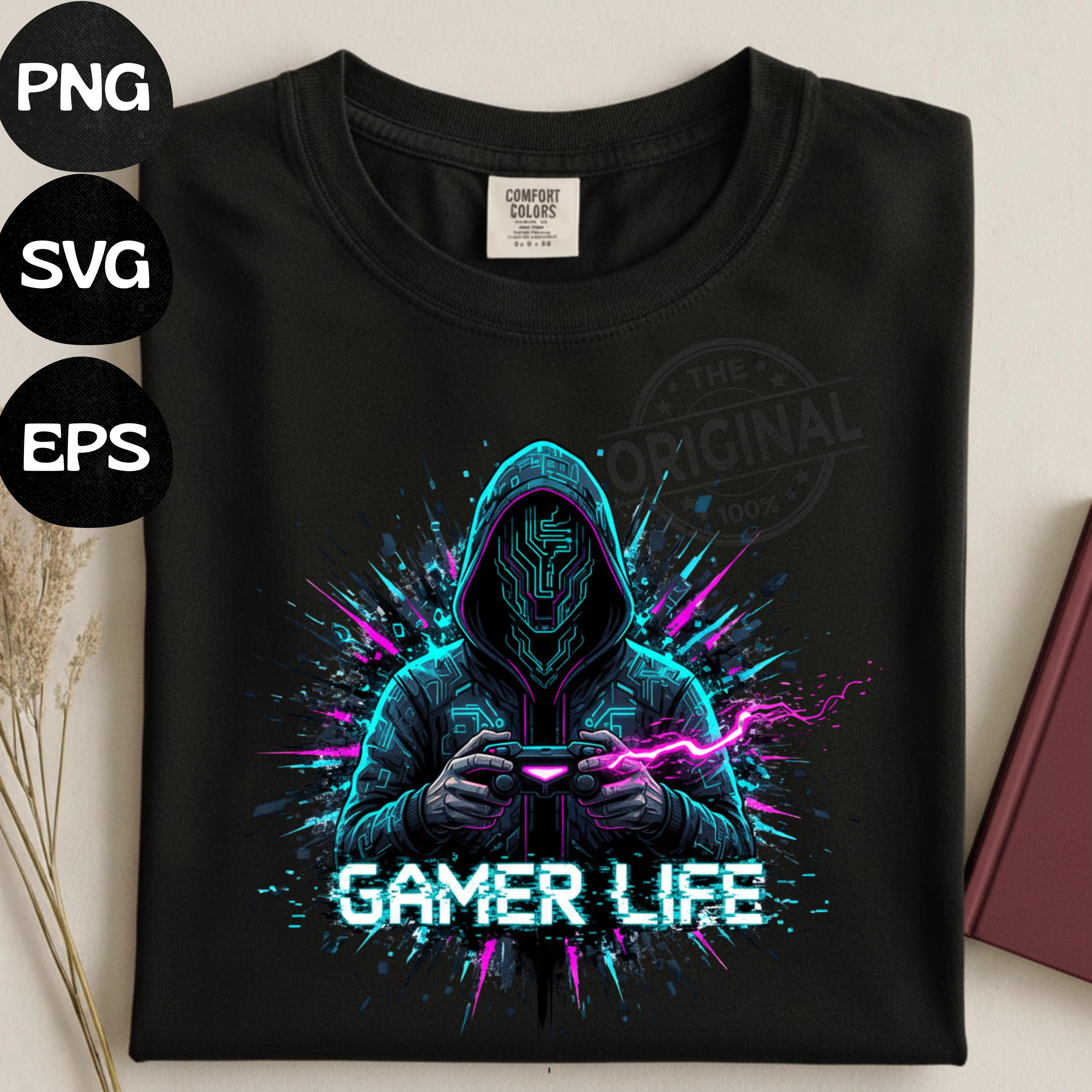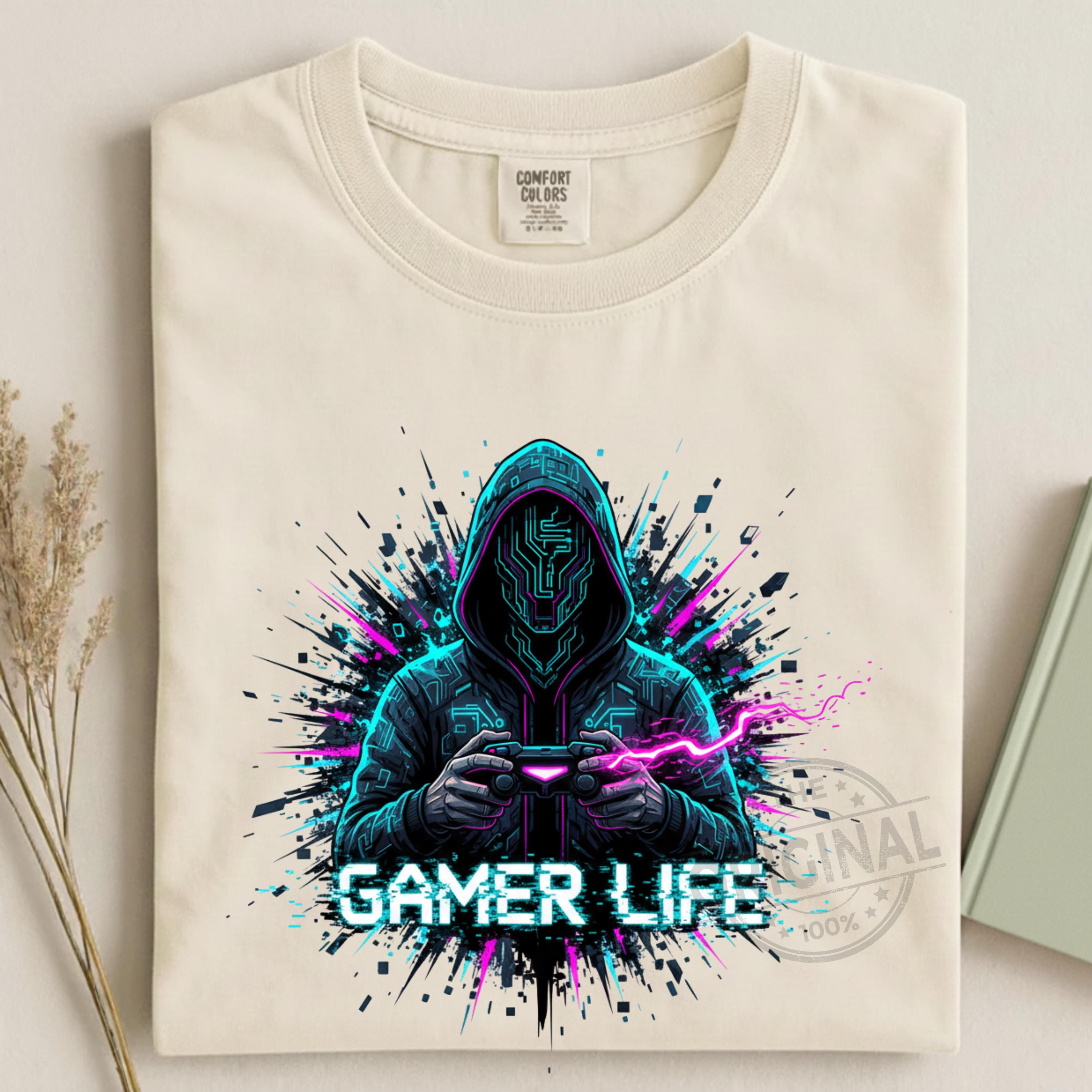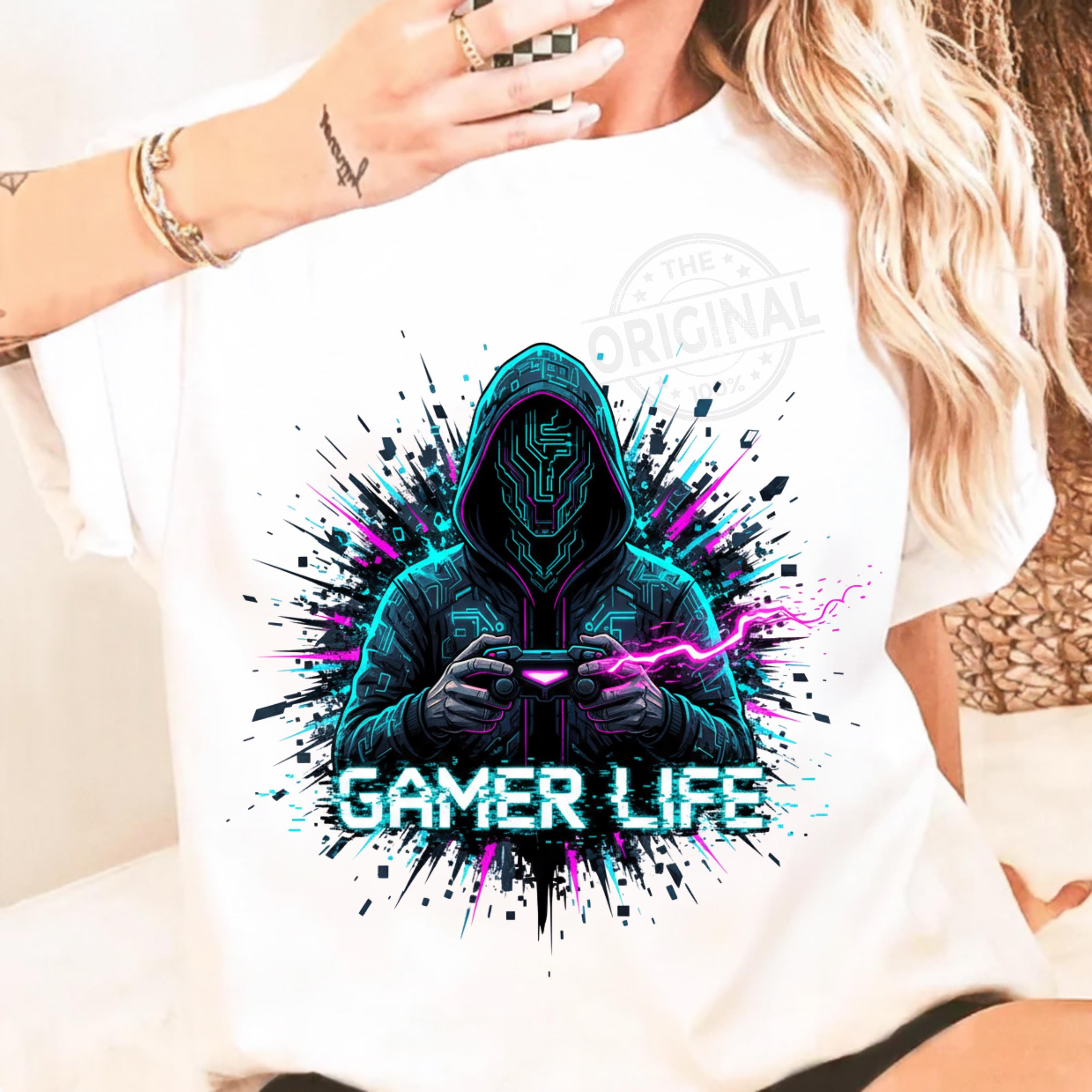 Neon Gamer Life Shirt Design PNG SVG EPS, Cyberpunk Gamer Clipart, Glitch Video Game Controller Art, Gaming Gift for Teens