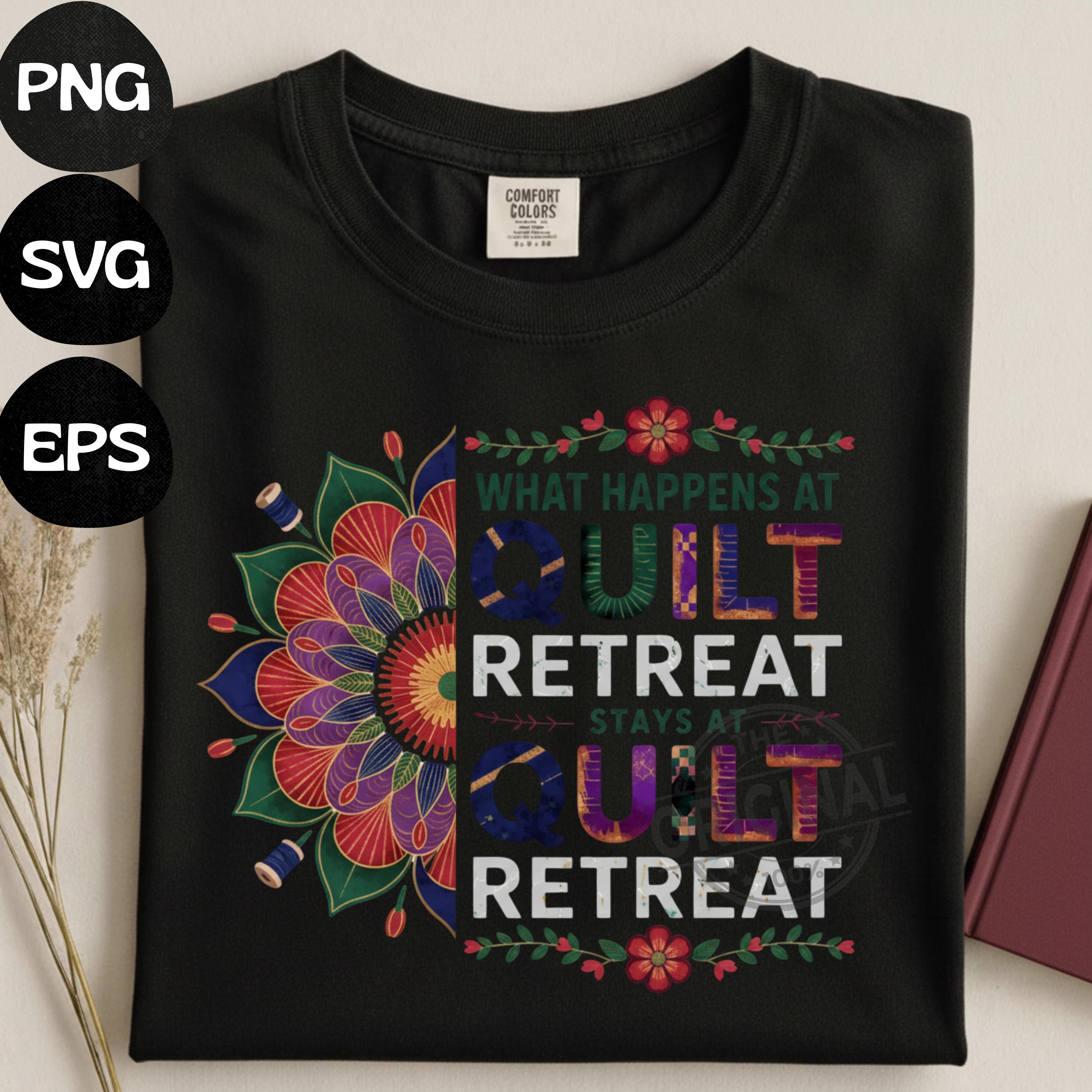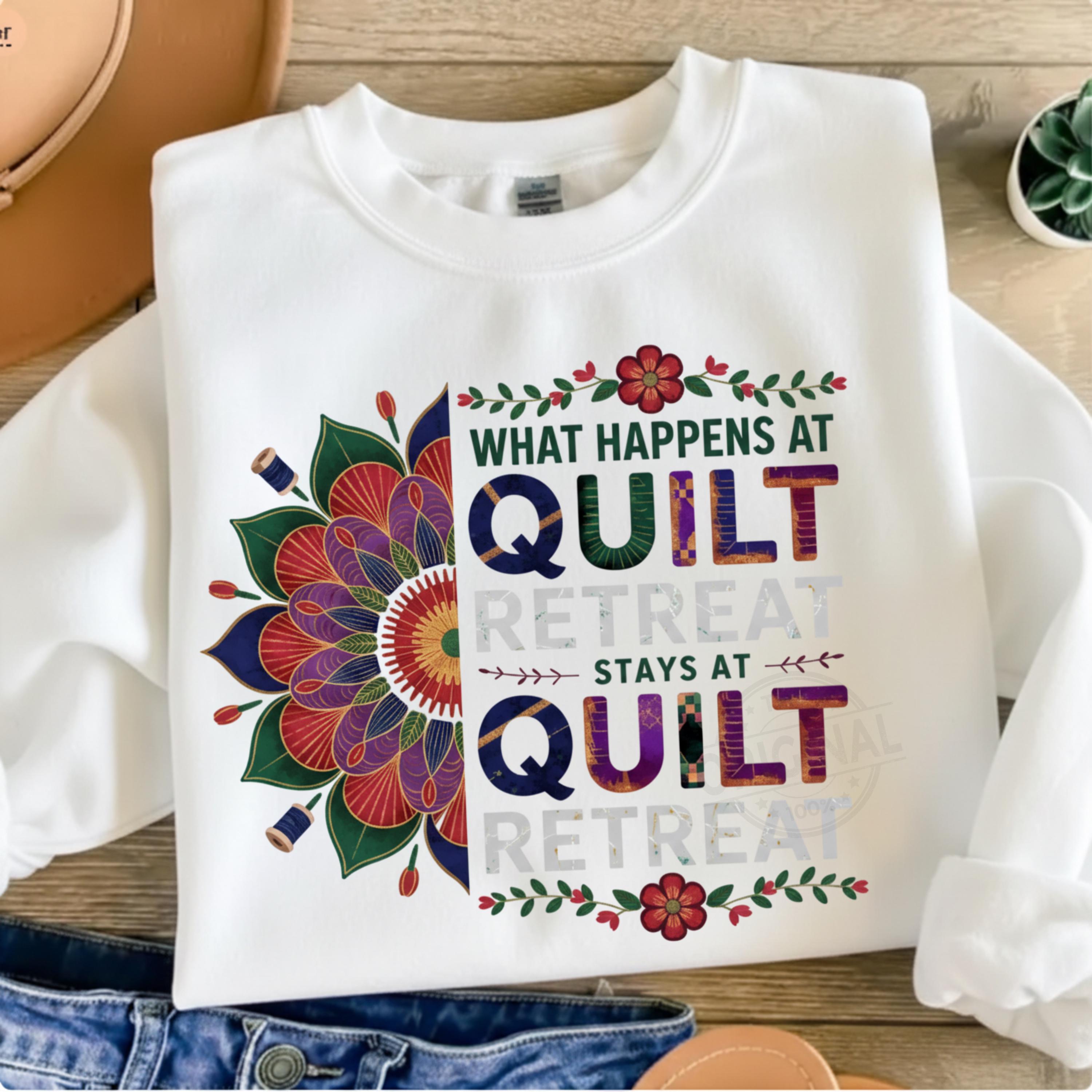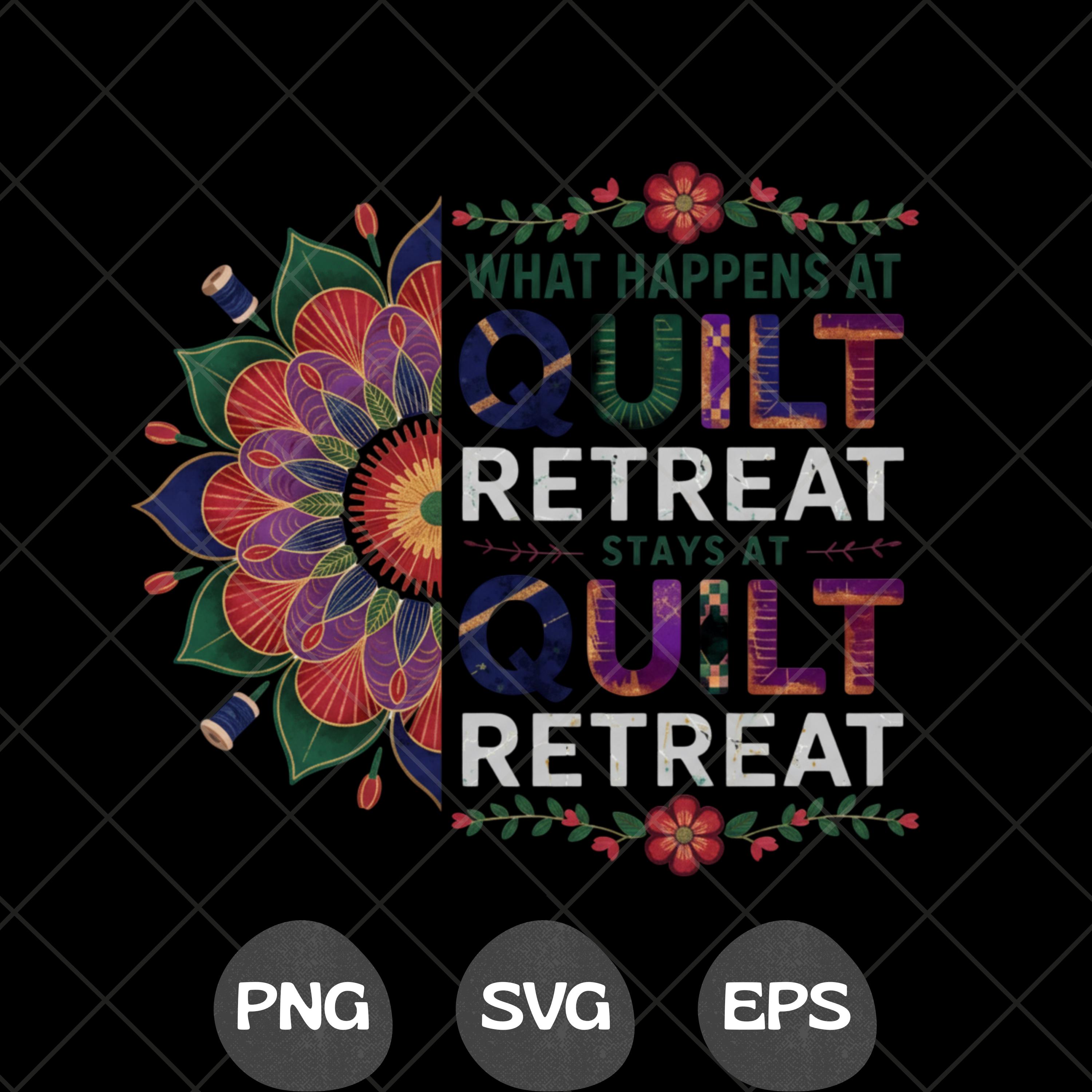 Bring some humor to your sewing projects with this “What Happens At Quilt Retreat Stays At Quilt Retreat” digital design. Perfect for quilting enthusiasts, sewing retreats, quilt guild events, and cottagecore crafters. Ideal for making shirts, tote bags, signs, and other creative DIY projects with Cricut, Silhouette, and more.