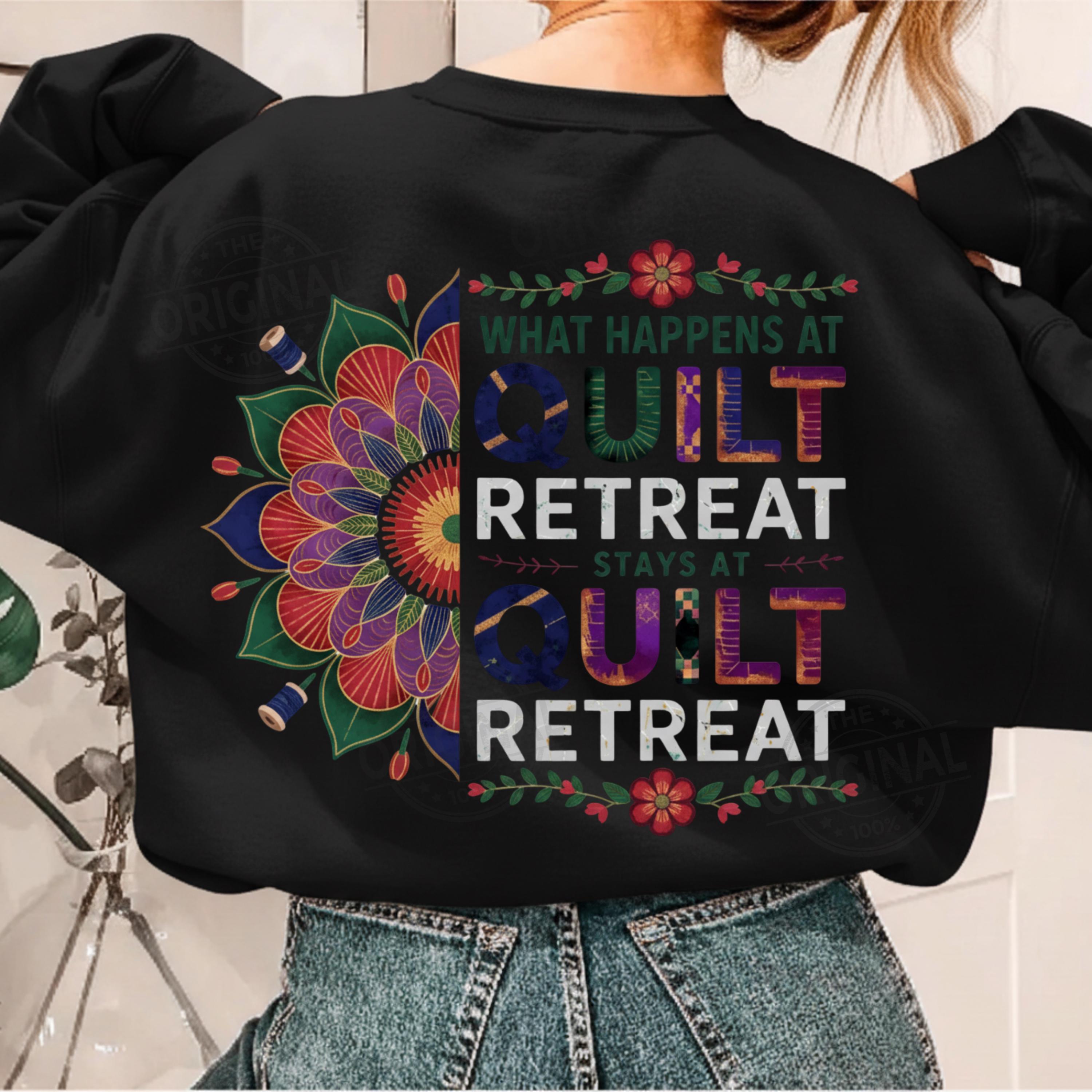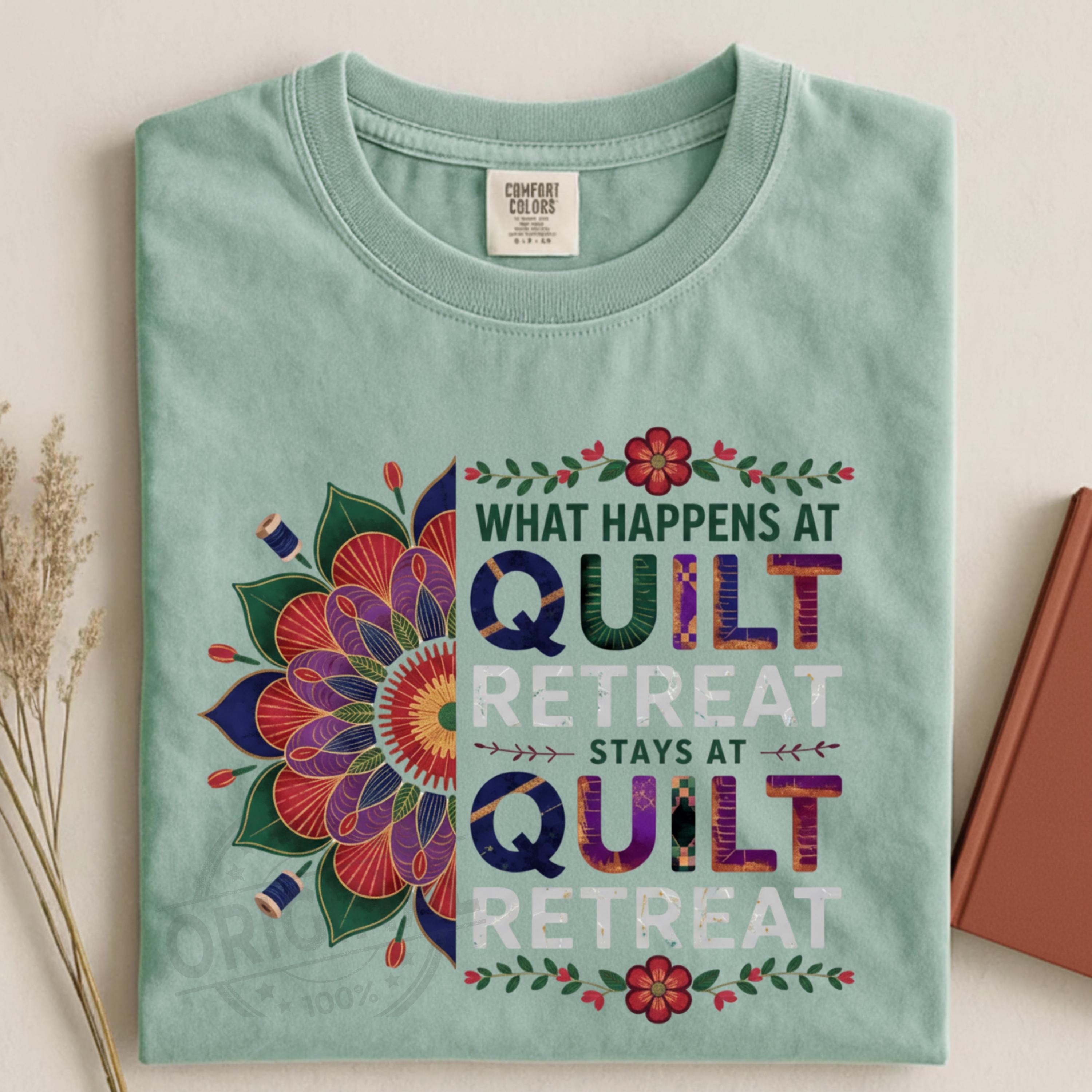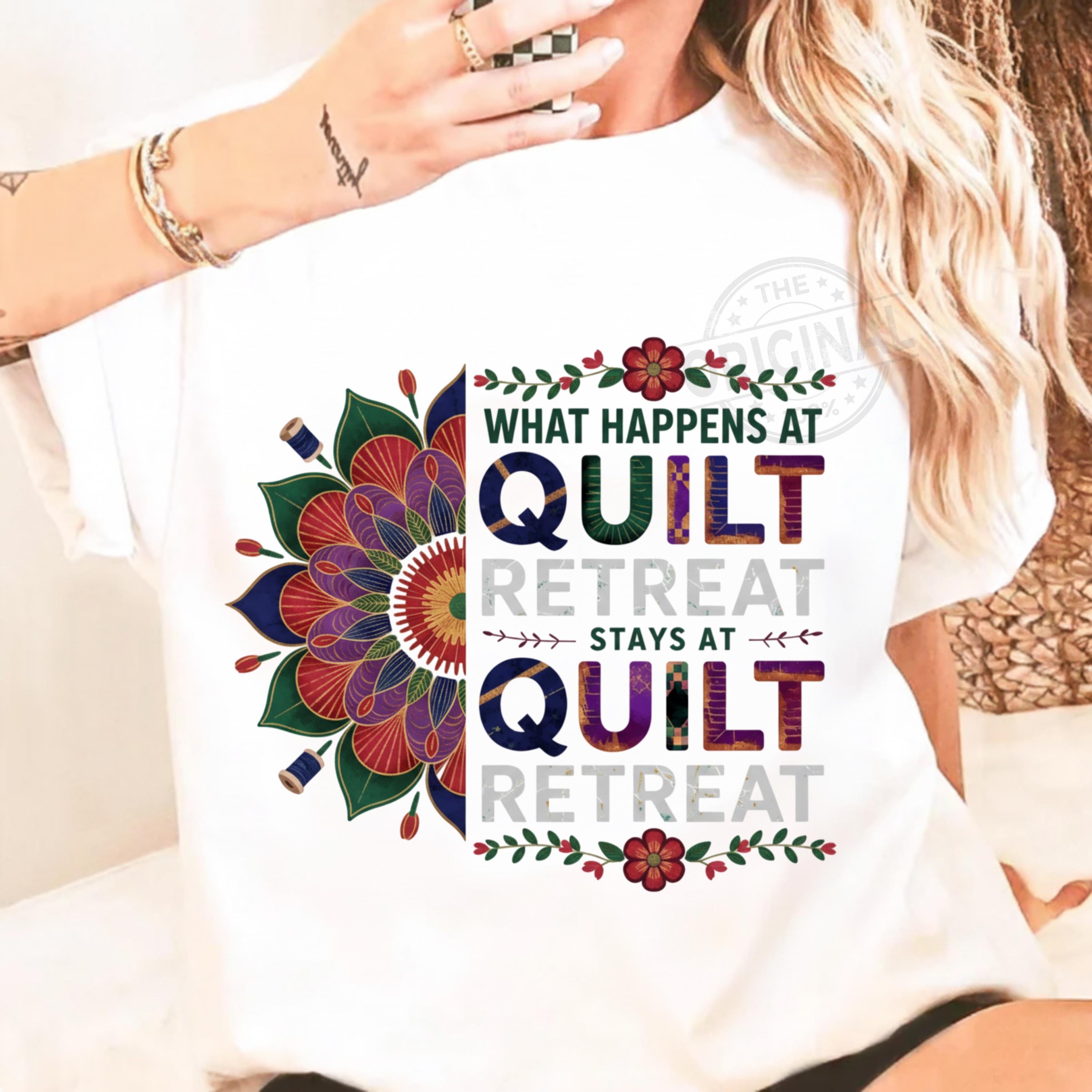 Bring some humor to your sewing projects with this “What Happens At Quilt Retreat Stays At Quilt Retreat” digital design. Perfect for quilting enthusiasts, sewing retreats, quilt guild events, and cottagecore crafters. Ideal for making shirts, tote bags, signs, and other creative DIY projects with Cricut, Silhouette, and more.
