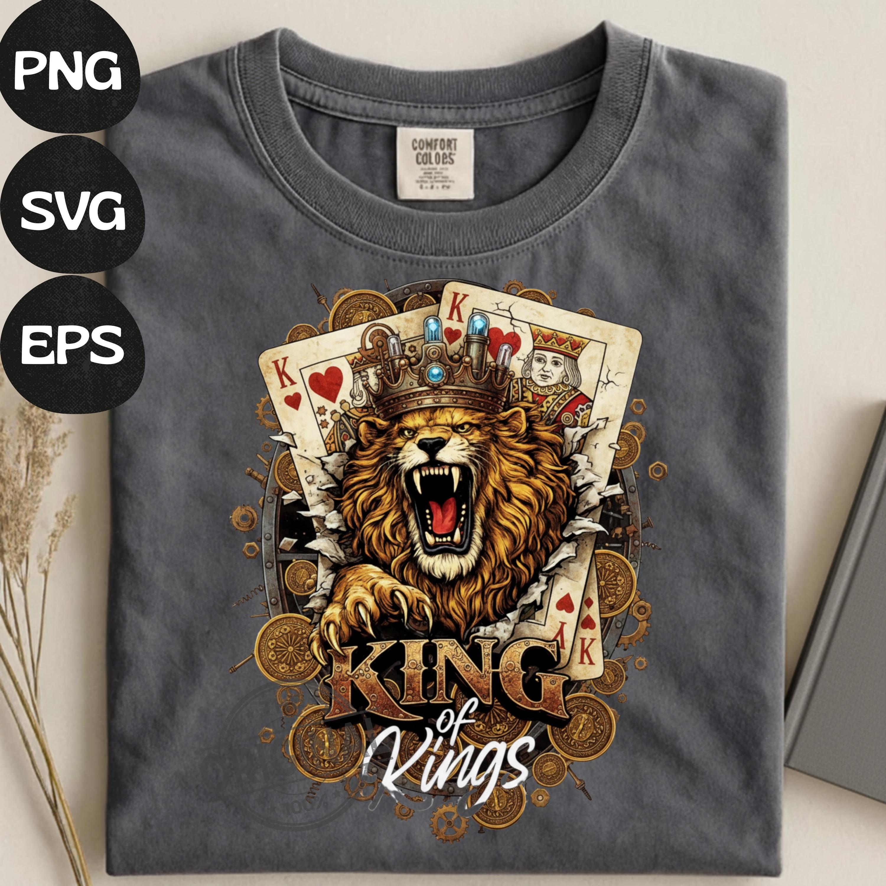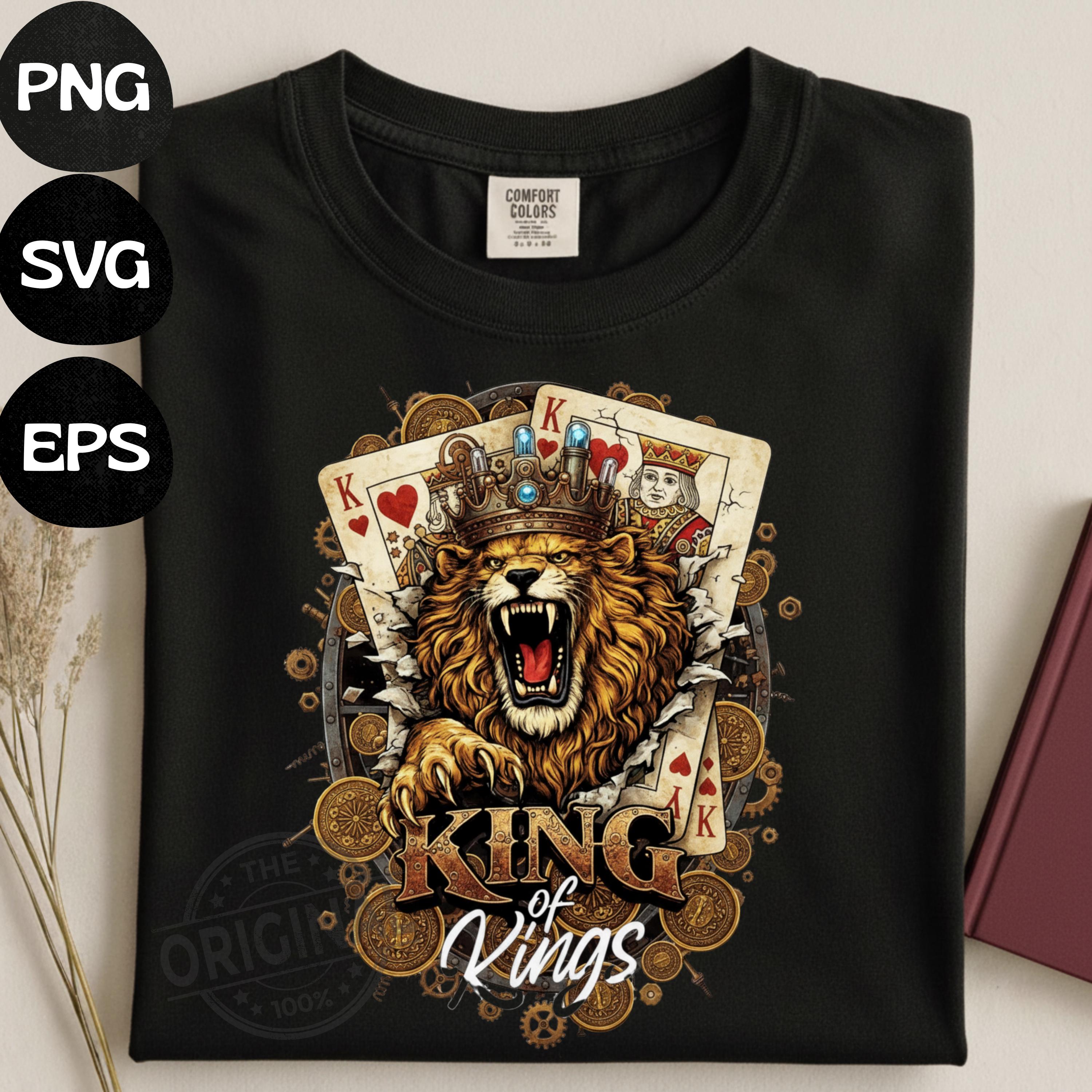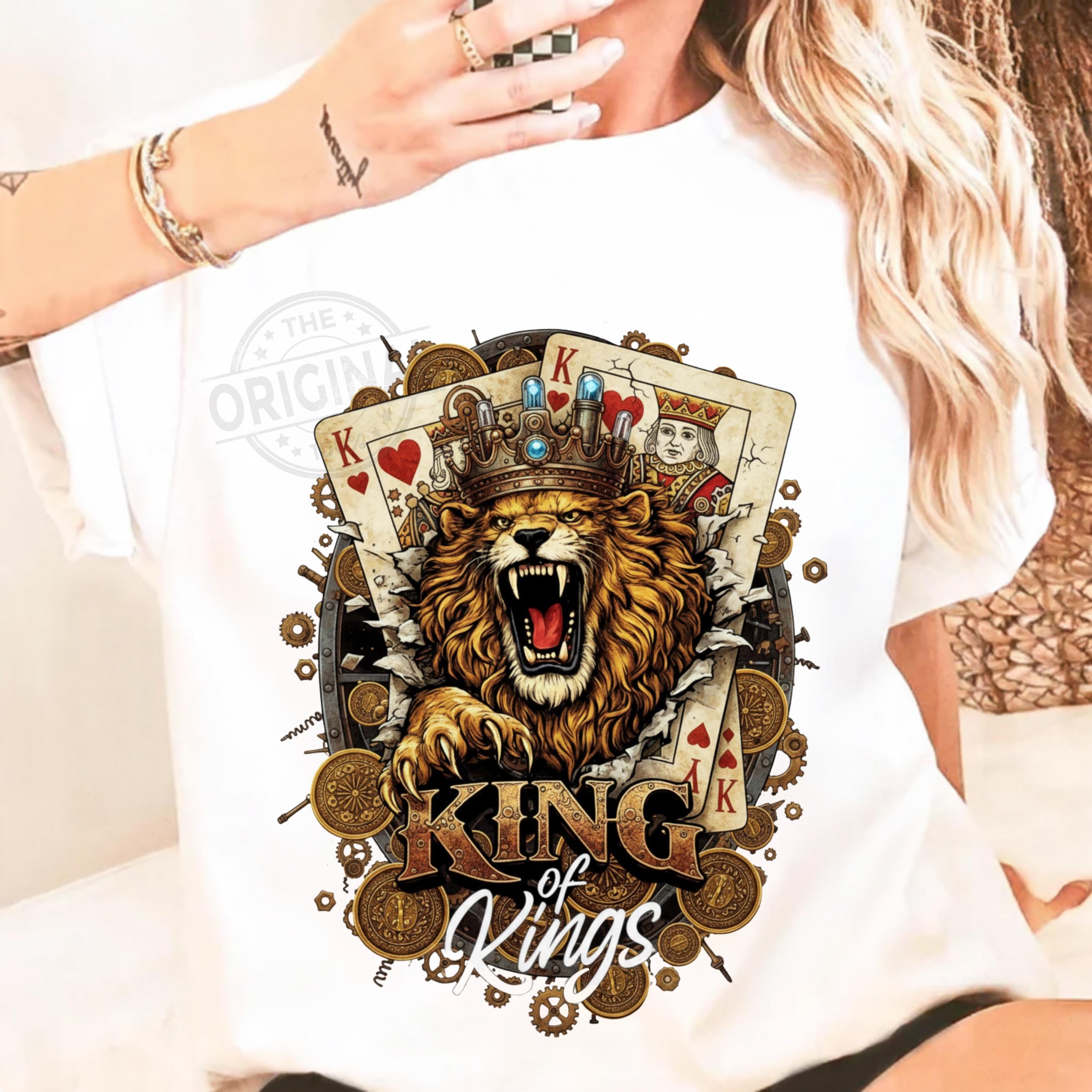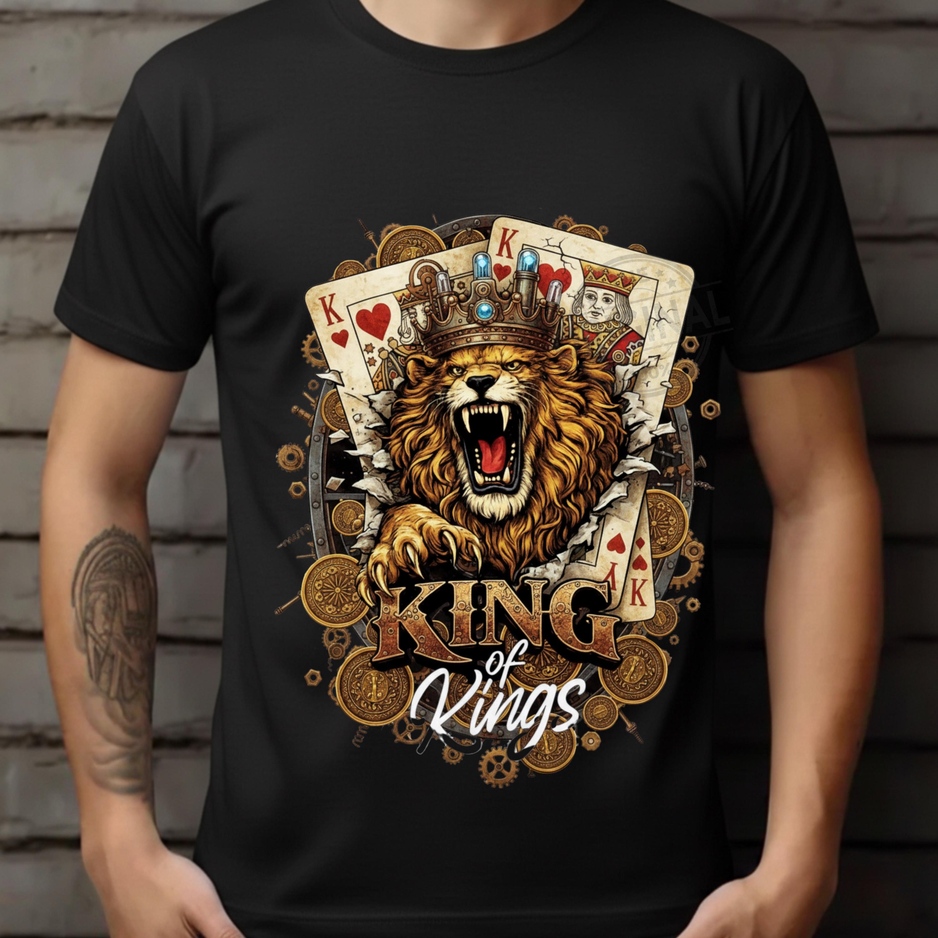 King of Kings Shirt SVG PNG, Lion King Playing Cards Design, Royal Gambling T-Shirt Graphic, Poker King Sublimation a perfect combination of royalty, strength and card game vibes, Ideal for poker lovers, casino fans, card players and anyone who loves powerful, masculine designs with attitude.