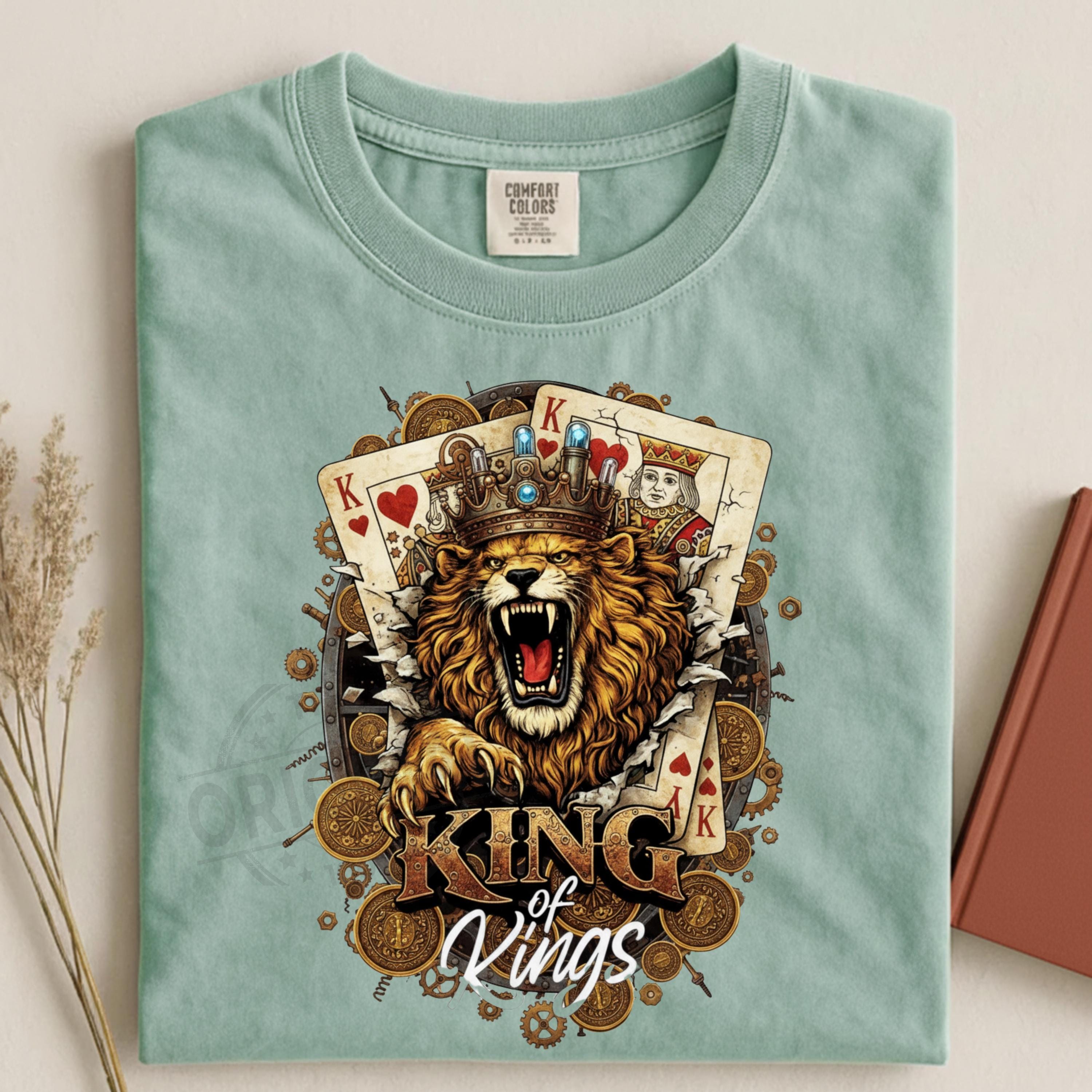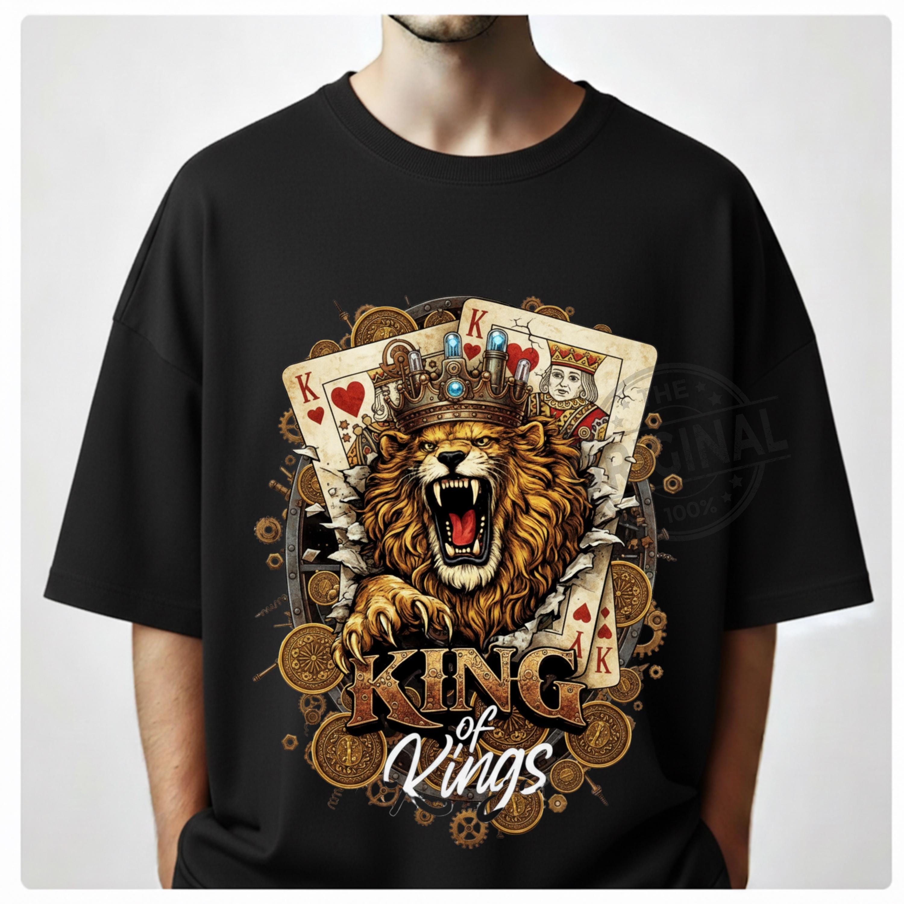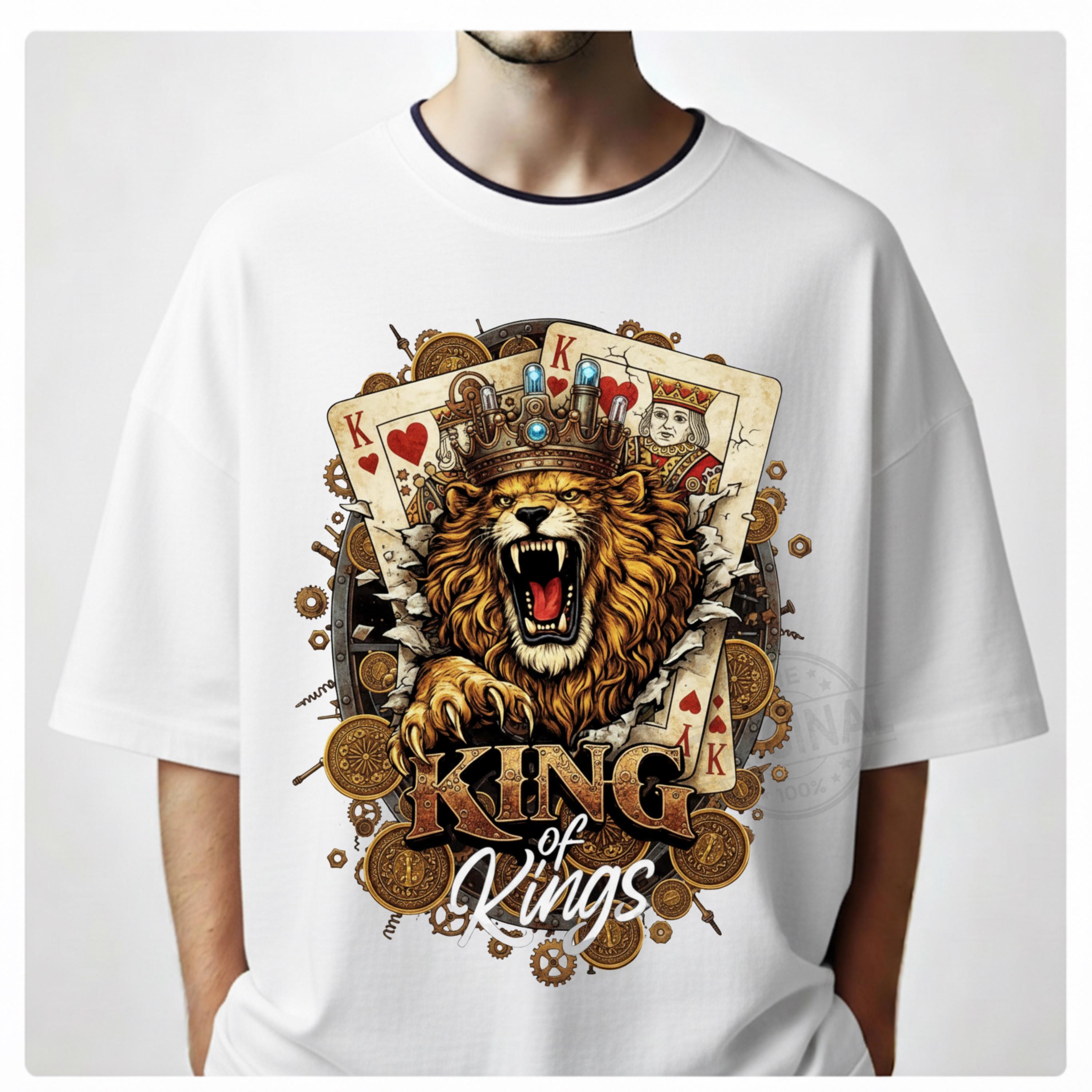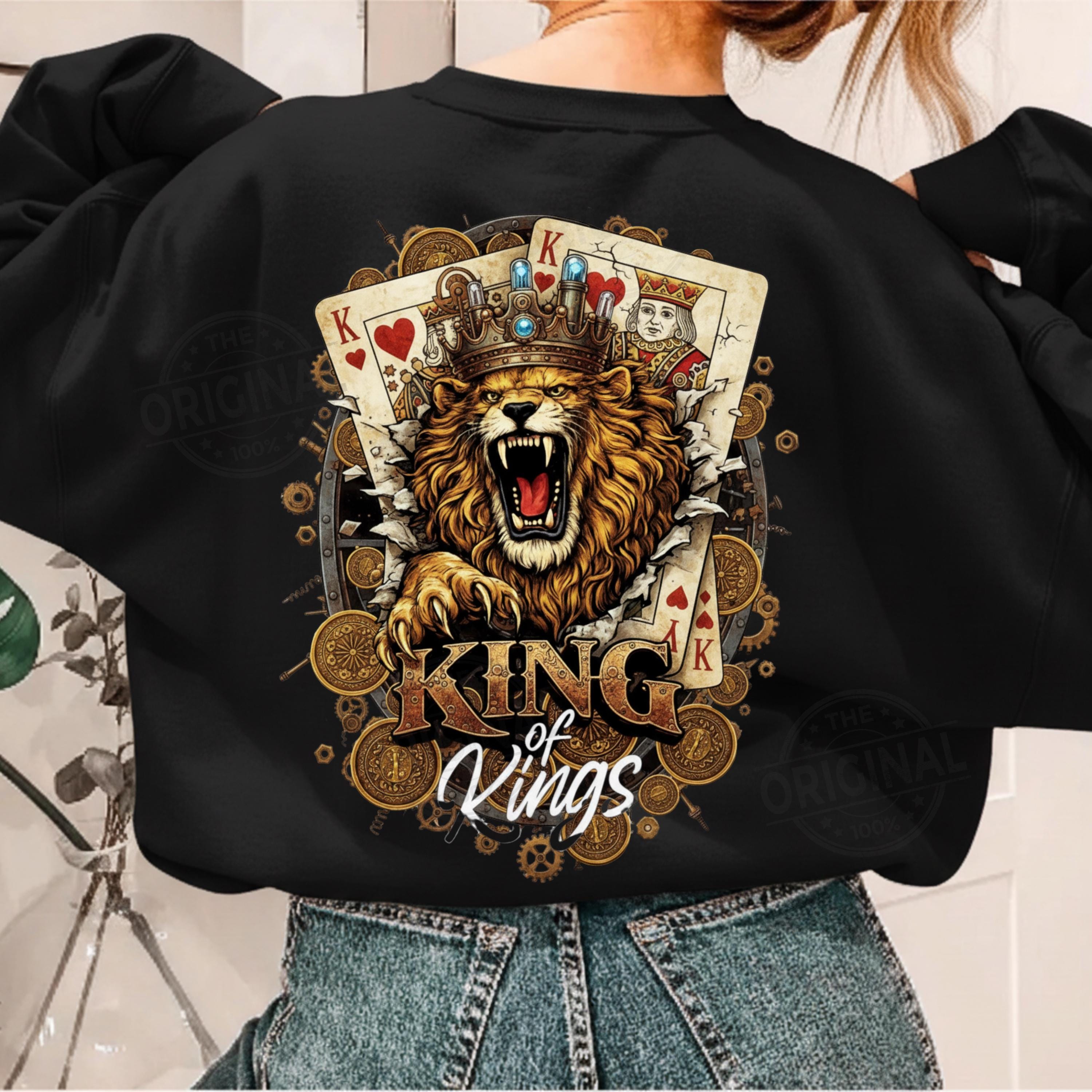 King of Kings Shirt SVG PNG, Lion King Playing Cards Design, Royal Gambling T-Shirt Graphic, Poker King Sublimation a perfect combination of royalty, strength and card game vibes, Ideal for poker lovers, casino fans, card players and anyone who loves powerful, masculine designs with attitude.