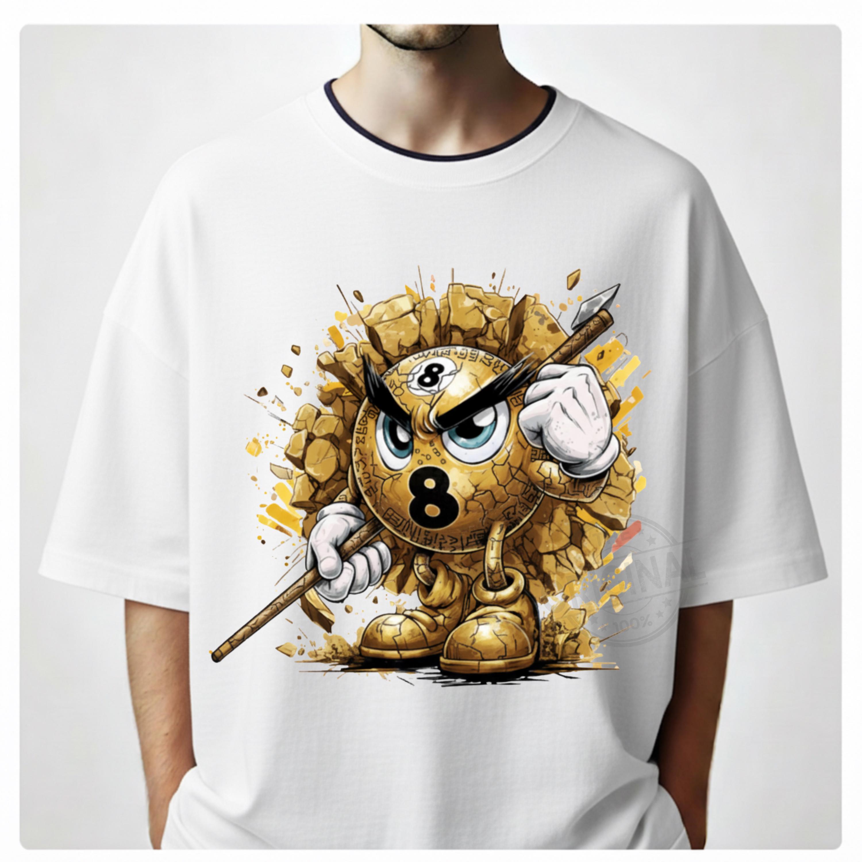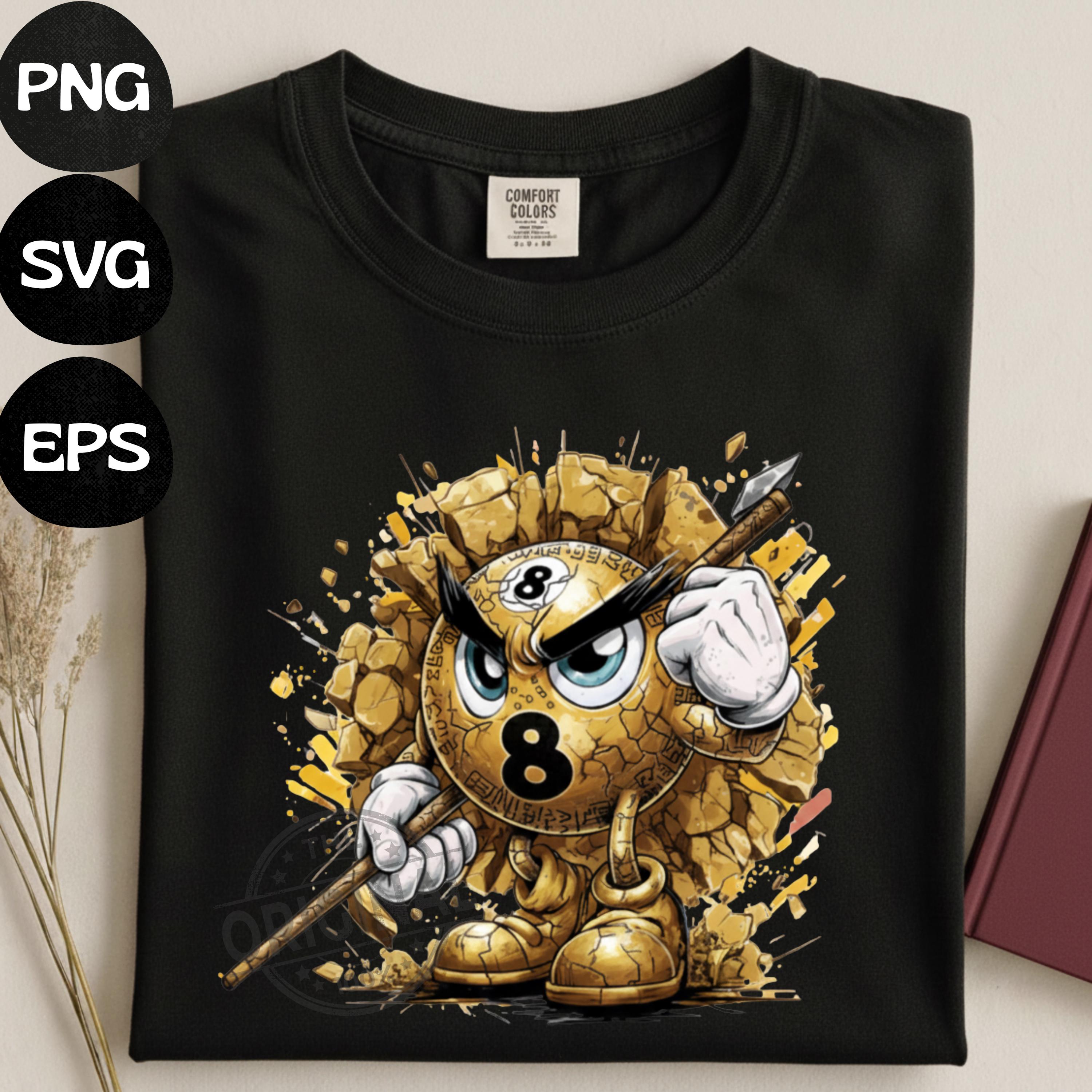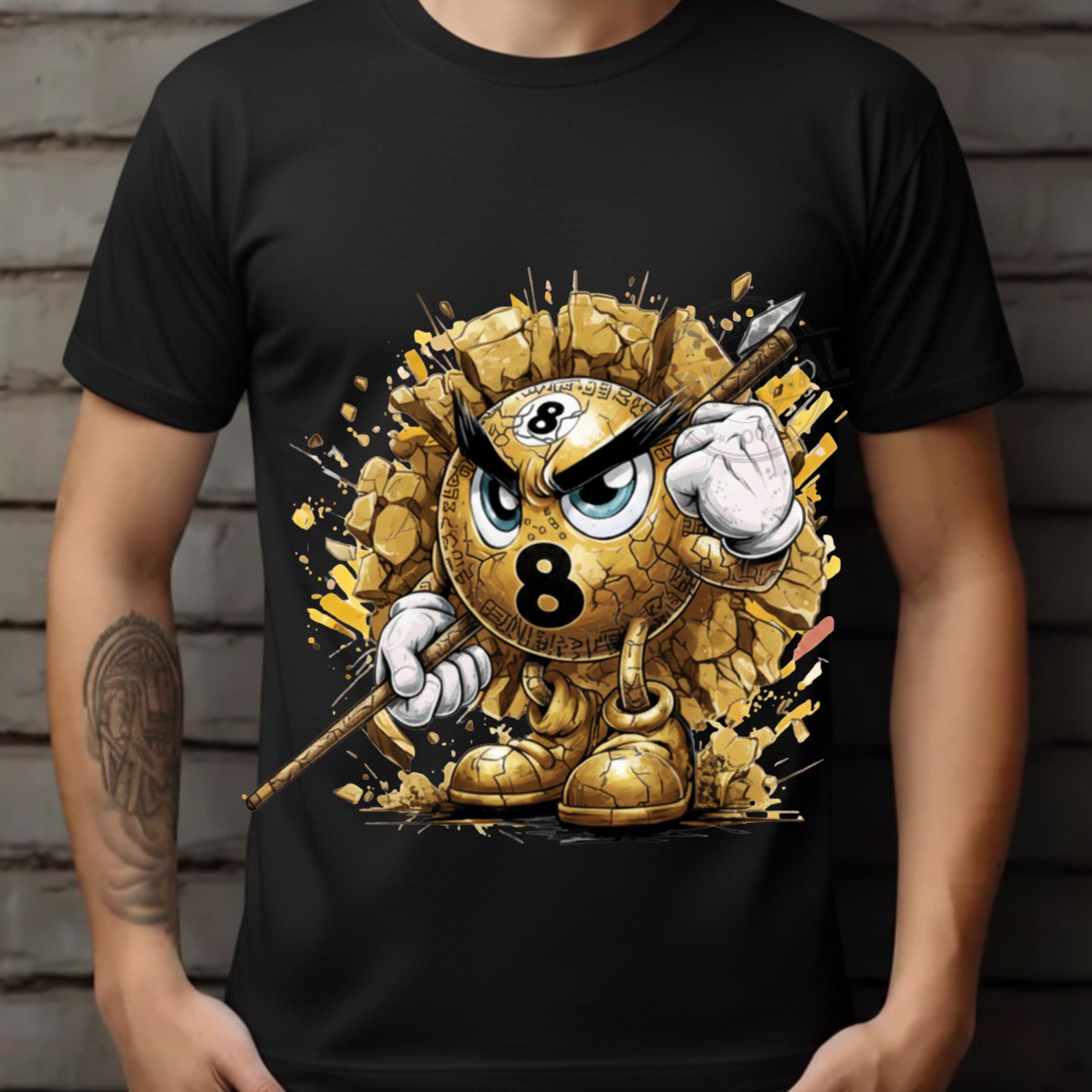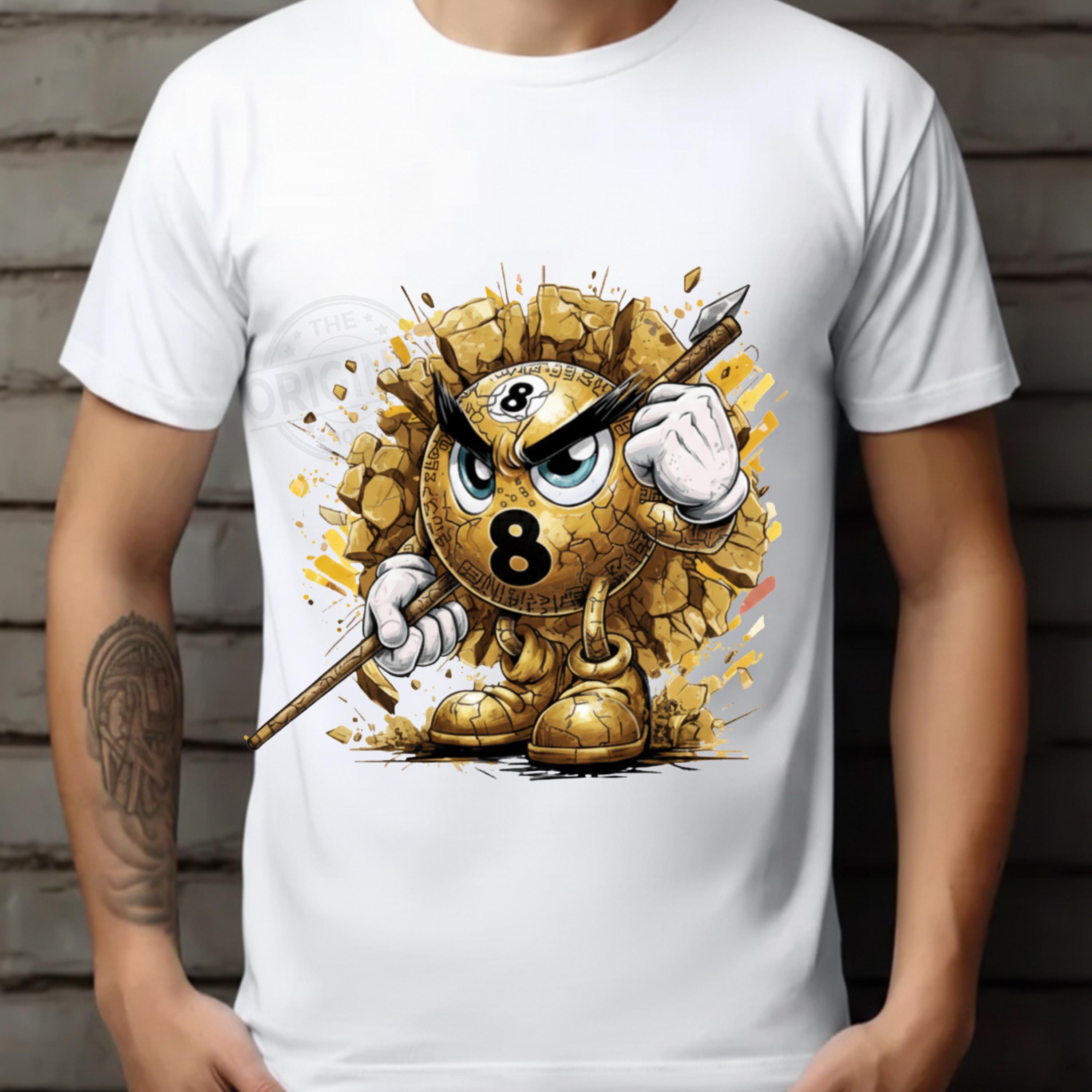 This Golden design features an angry Number 8 billiard ball bursting through broken concrete, gripping a cue stick and ready for battle.