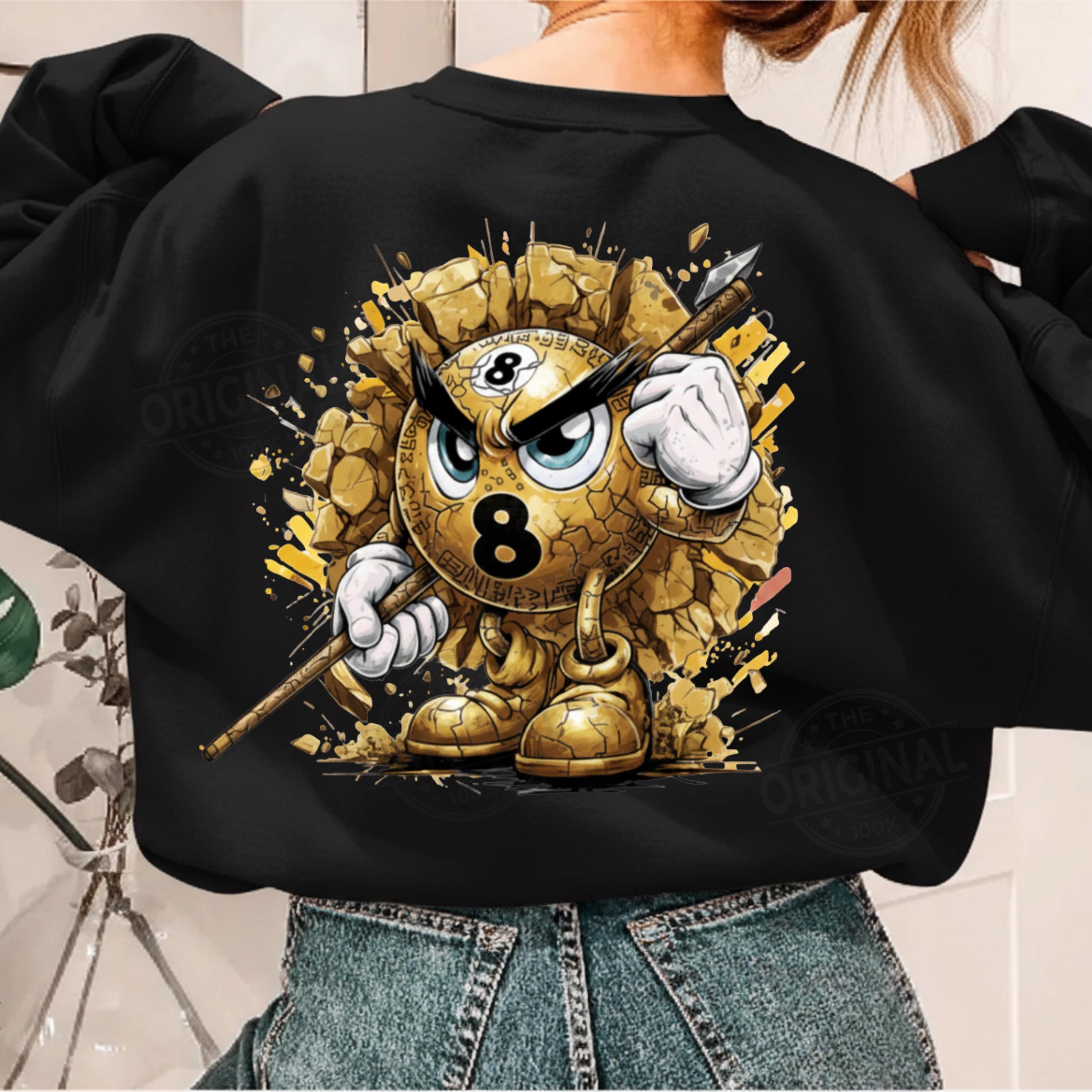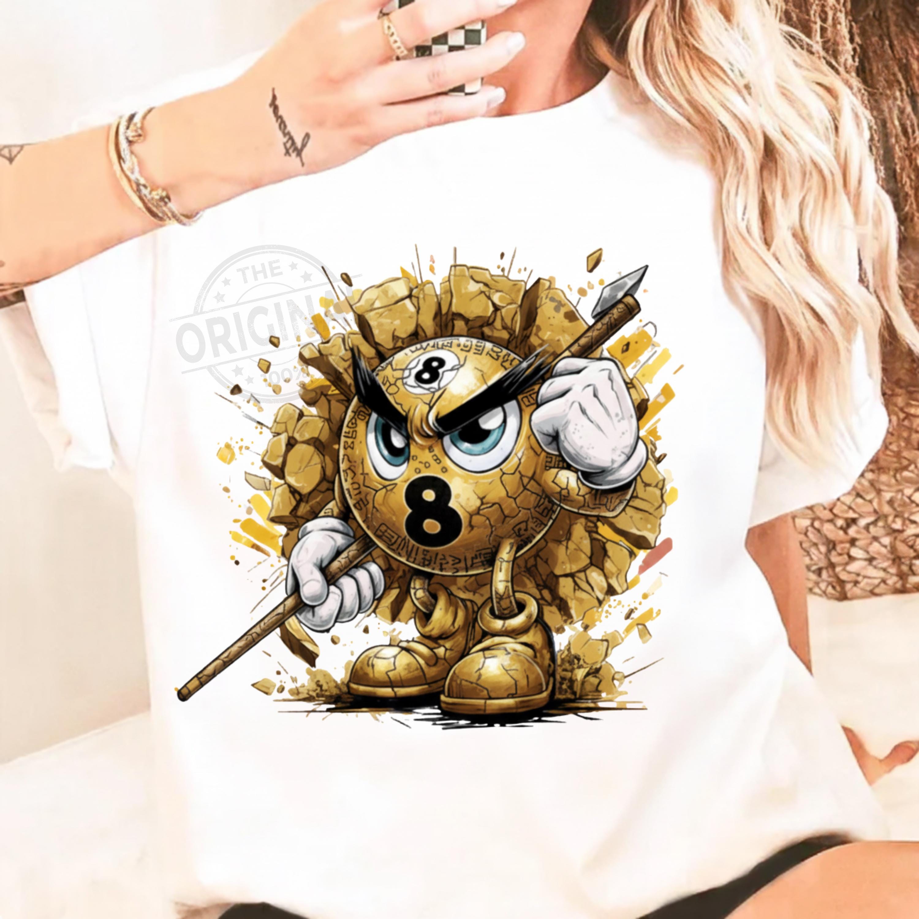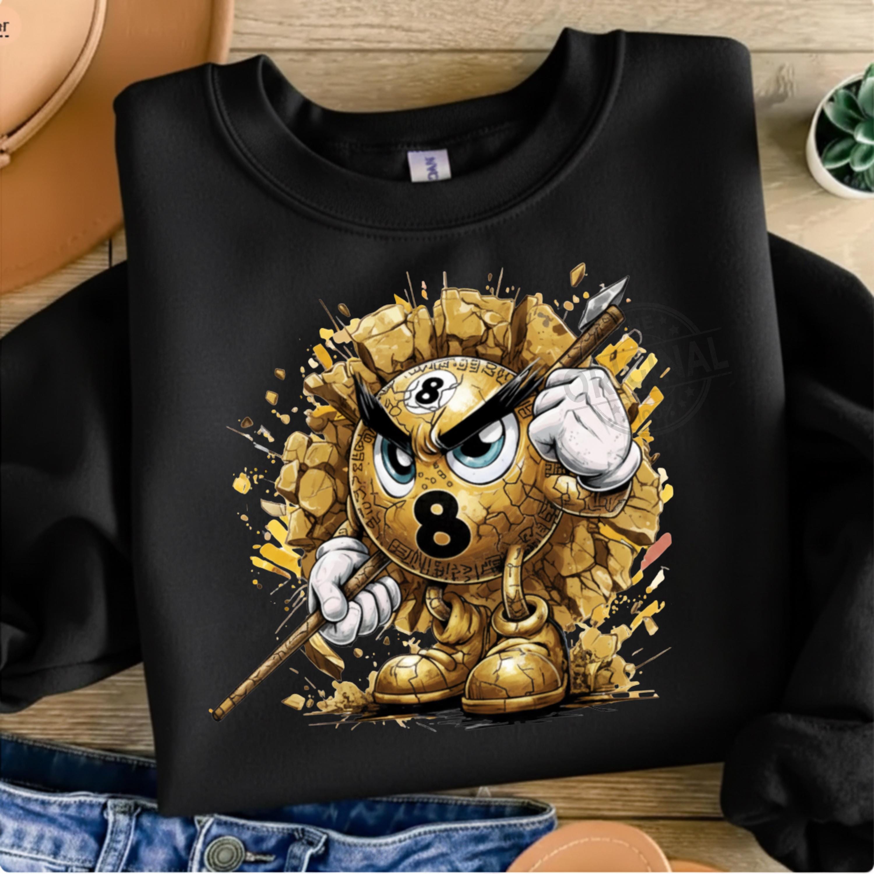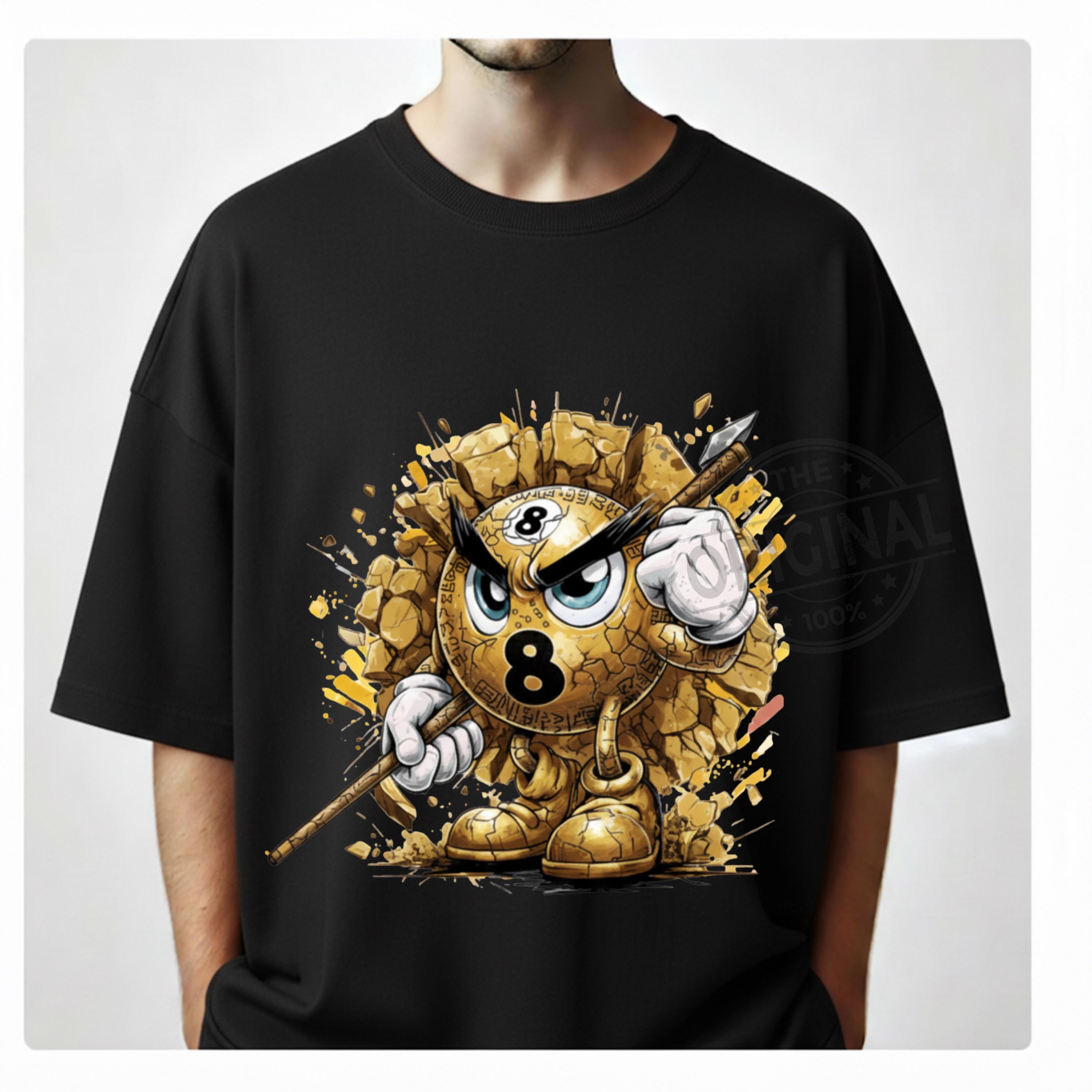 This Golden design features an angry Number 8 billiard ball bursting through broken concrete, gripping a cue stick and ready for battle.